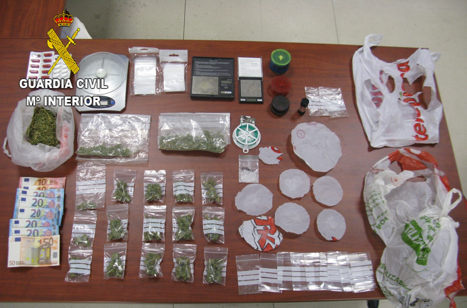 Con toda la información recopilada por la Guardia Civil se solicitó de la Autoridad Judicial competente la entrada y registro en la citada vivienda en la que procedió a la intervención de marihuana. Esta se encontraba dosificada en 15 bolsas de plástico, lista para su venta, con un peso de 33 gramos, así como sustancia de marihuana picada en una bolsa preparada para su envasado con un peso de 39 gramos. También se localizaron tres básculas de precisión para el pesaje con restos de marihuana, y útiles para su preparación; también se encontró en una de las básculas y encima de la tapa de dos ordenadores, restos de una sustancia de color blanco que analizada con reactivo adecuado dio positivo en cocaína. En la casa también había macetas para el cultivo de Cannabis Sativa y una de las habitaciones estaba preparada para secadero de las plantas una vez recolectadas.