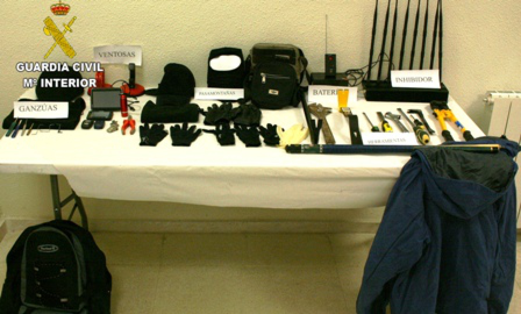 Los vehículos iban ocupados por tres personas, a las que se les ocuparon en el interior de los turismos un inhibidor de frecuencias para anular la señal de las alarmas, un detector de cámaras infrarrojas, un aerosol de nitrógeno para fracturar cerraduras, gorros, bufandas tubulares, guantes, así como diversa herramienta para cometer los robos tales como: palancas, cizallas, gatos hidráulicos, destornilladores, llaves, etc.