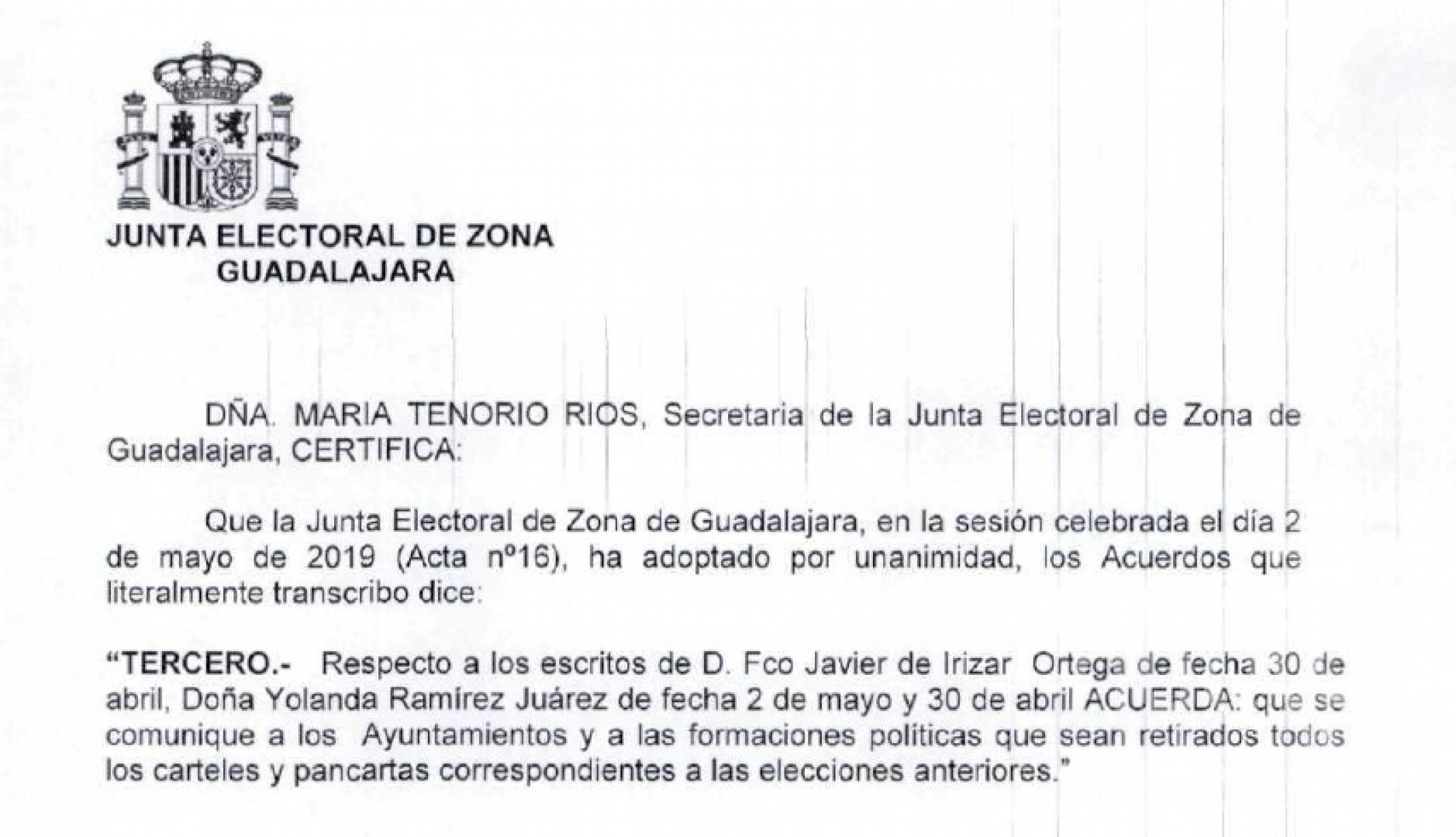 La Junta Electoral ha ordenado retirar los carteles, pancartas y banderolas de las elecciones generales de cara a la próxima celebración de las municipales y autonómicas. Atiende de esta forma la petición realizada por Yolanda Ramírez, candidata a la alcaldía de El Casar-Mesones por Contigo Somos Democracia, quien solicitó su retirada “por ser contraria su permanencia a la Ley Electoral y así perjudicar a todos aquellos partidos políticos que no concurrieron a los comicios generales y que sí concurren a las municipales, como es nuestro caso”.
