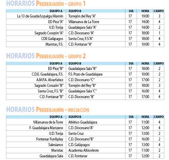 En el grupo 1 de Prebenjamín el partido de la jornada será el que enfrente al Guadalajara Sala A ante el Torija. Los capitalinos aún no han perdido, mientras que los de Torija solo han caído en un encuentro. En este grupo también se vivirá el duelo menos equilibrado, a priori, entre el líder invicto, Diocesano A y el colista, Sagrado Corazón A.