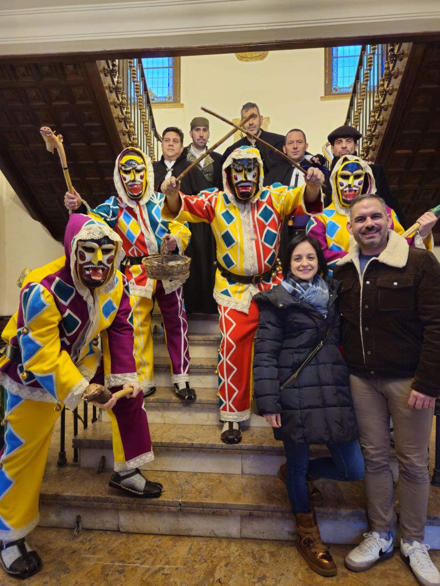 Los cuatro componentes de la Botarga —el manda, los mandaderos y la botarguilla— fueron recibidos en el Ayuntamiento de Guadalajara por el concejal de Festejos, Santiago López, mientras que los concejales Javier Toquero, Alfonso Esteban y Chema Antón acompañaron al grupo en su tradicional recorrido por la calle Mayor rumbo a la iglesia de Santiago.