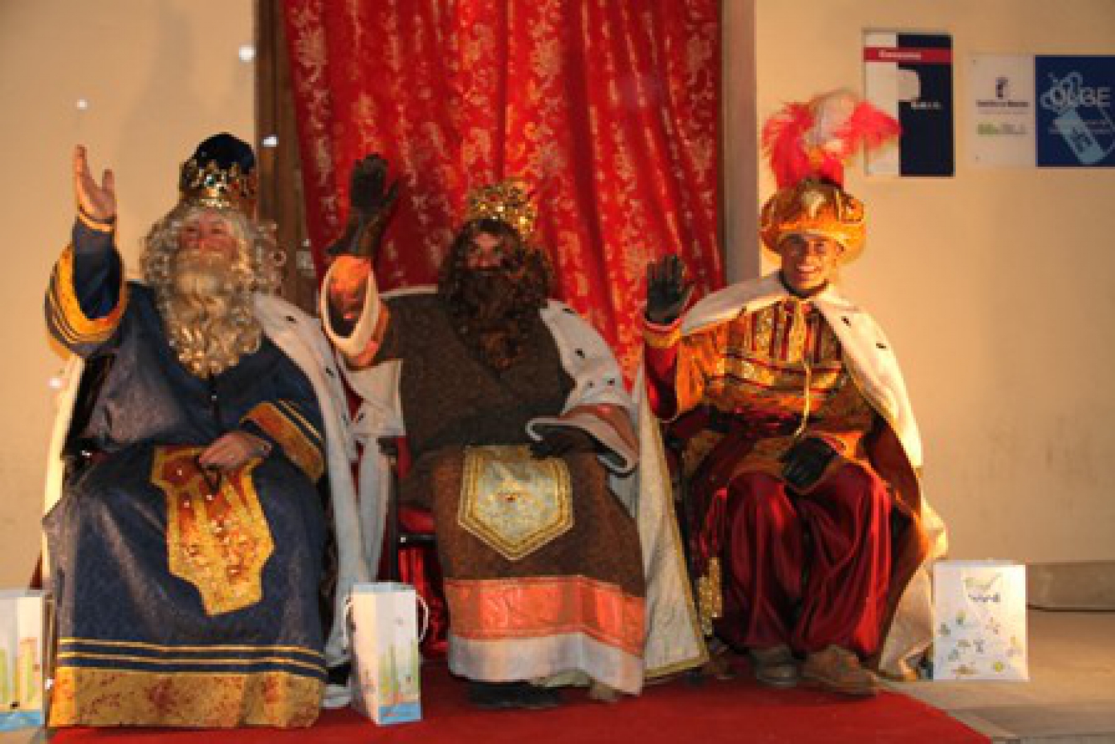 Cuando ya de vuelta por la calle del Vivero, la carroza estaba a punto de pasar sobre el gran río, sonó la gran traca final, antes de que los Magos subieran a pie por la calle Calaveras hasta la Plaza Mayor. Melchor, Gaspar y Baltasar tuvieron tiempo para, sentados en sus tronos al pie del Ayuntamiento, recoger las últimas peticiones de los niños. Desde la balconada de la Casa Consistorial caía nieve artificial, mientras los más pequeños, sobre una alfombra roja flanqueada por antorchas encendidas, hacían, de la mano de los pajes, un intenso camino encarnado hasta llegar a los brazos de los magos con los ojos llenos, a partes iguales, de curiosidad y respeto. Y mientras los pequeños se acercaban a recordarles a los Reyes Magos sus deseos, se proyectaban, inmensos sobre la torre de la iglesia, los dibujos pintados en cristal en los que han estado trabajando en estos días en el taller de manualidades programado para llenar de creatividad el ocio infantil.