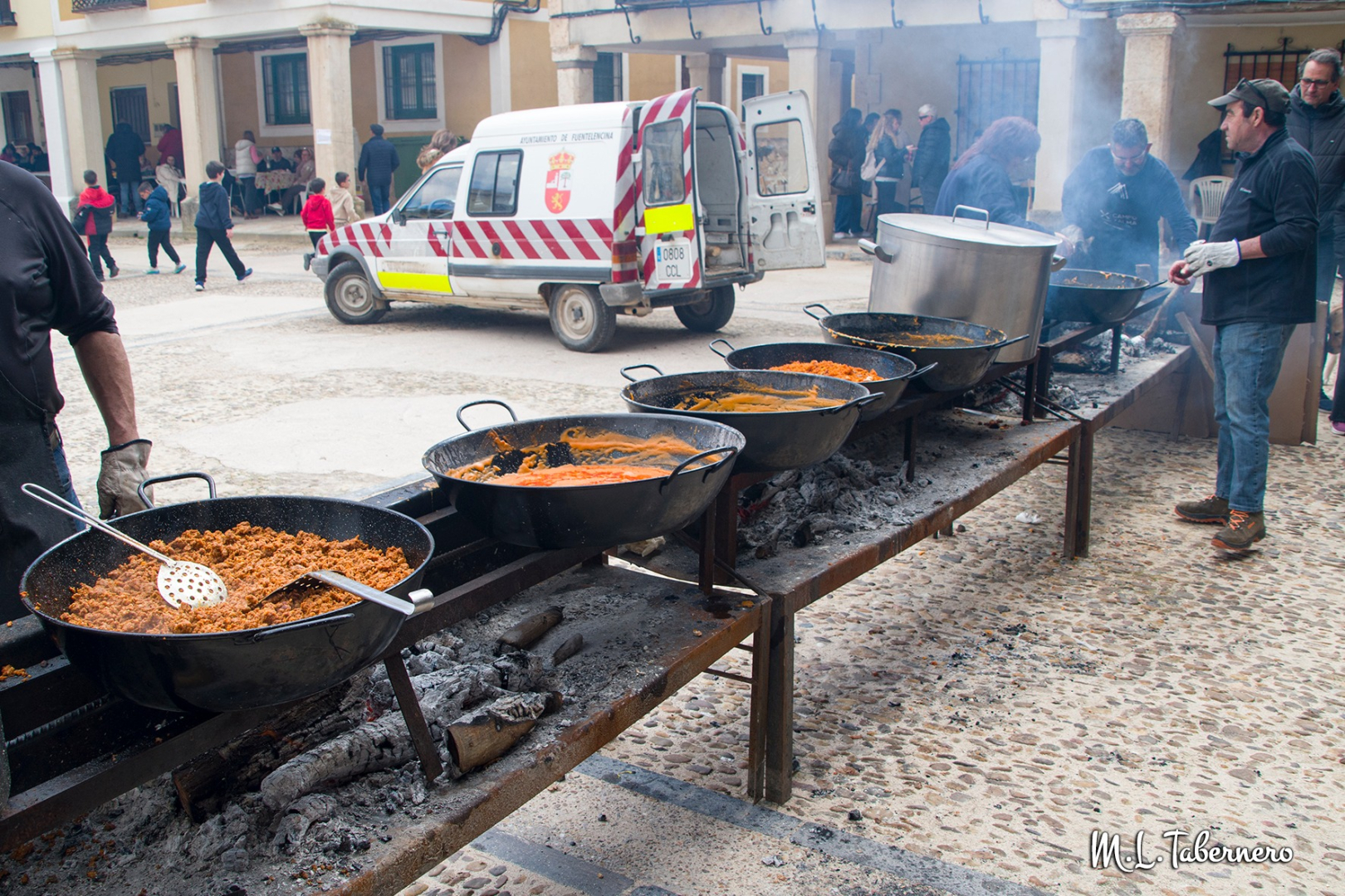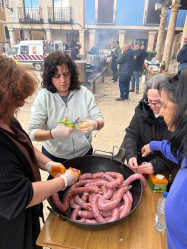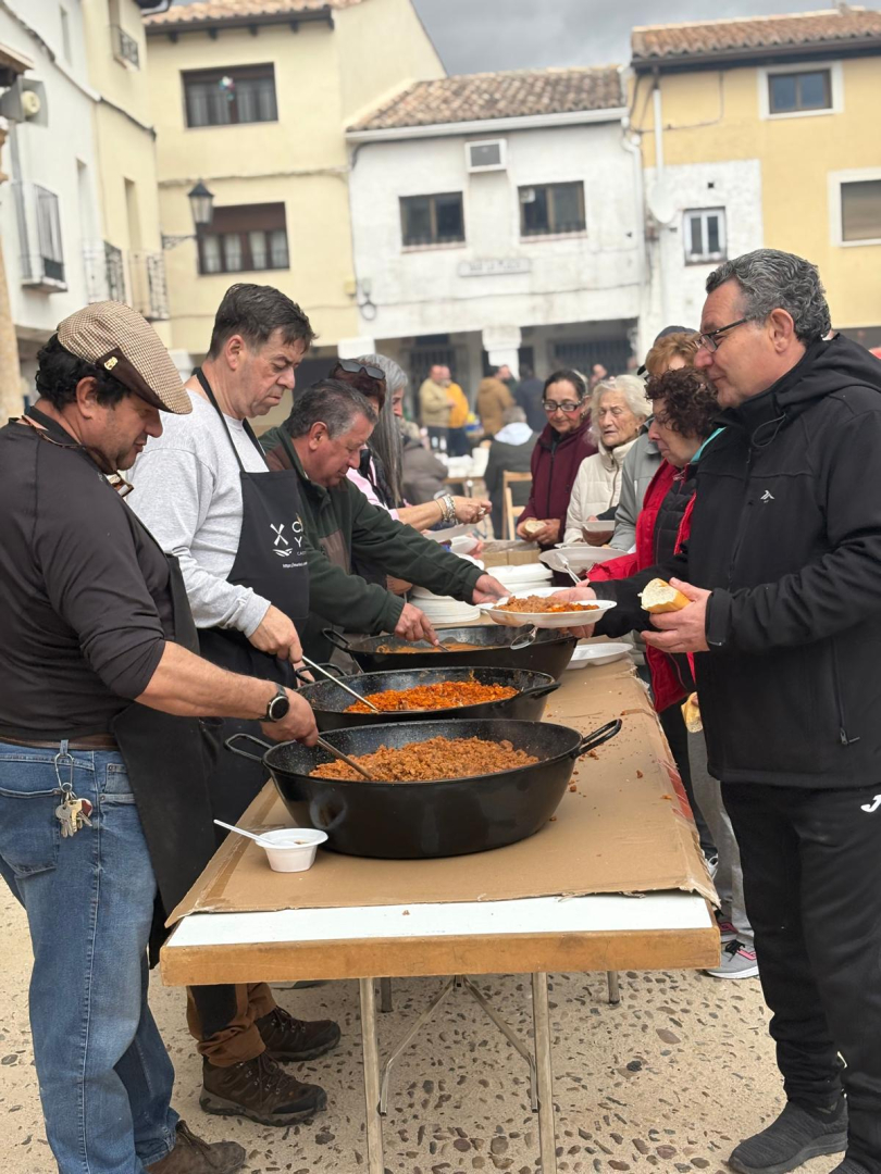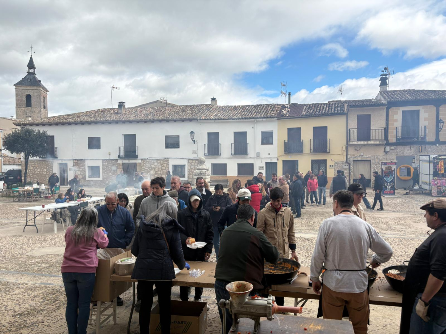 Desde temprano, la plaza mayor –con su iglesia al fondo vigilando como siempre– se llenó de mesas, paellas gigantes y voluntarios con delantales. El Ayuntamiento de Fuentelencina y la Asociación Cultural San Agustín lo organizaron todo: el despiece del cerdo, el embutido en vivo, las migas humeantes y las pruebas de picadillo que volaban de las sartenes. No faltaron las manos expertas removiendo en las grandes ollas, ni los niños correteando alrededor de inflables coloridos, mientras los mayores charlaban con un bocata en la mano.