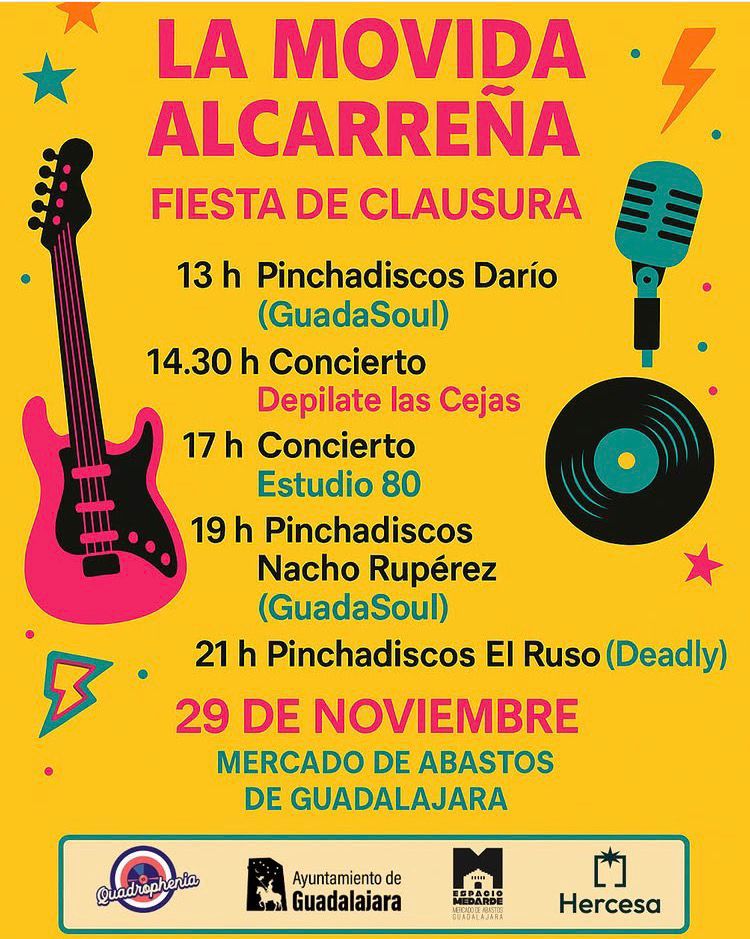 La Asociación Cultural Quadrophenia pone hoy el broche final a La Movida Alcarreña con una gran Fiesta de Clausura en el Mercado de Abastos de Guadalajara (MEDARDE). El proyecto, que ha logrado reunir a generaciones enteras, demuestra que la capital alcarreña vivió una escena musical y cultural capaz de competir con Madrid en vitalidad y creatividad.