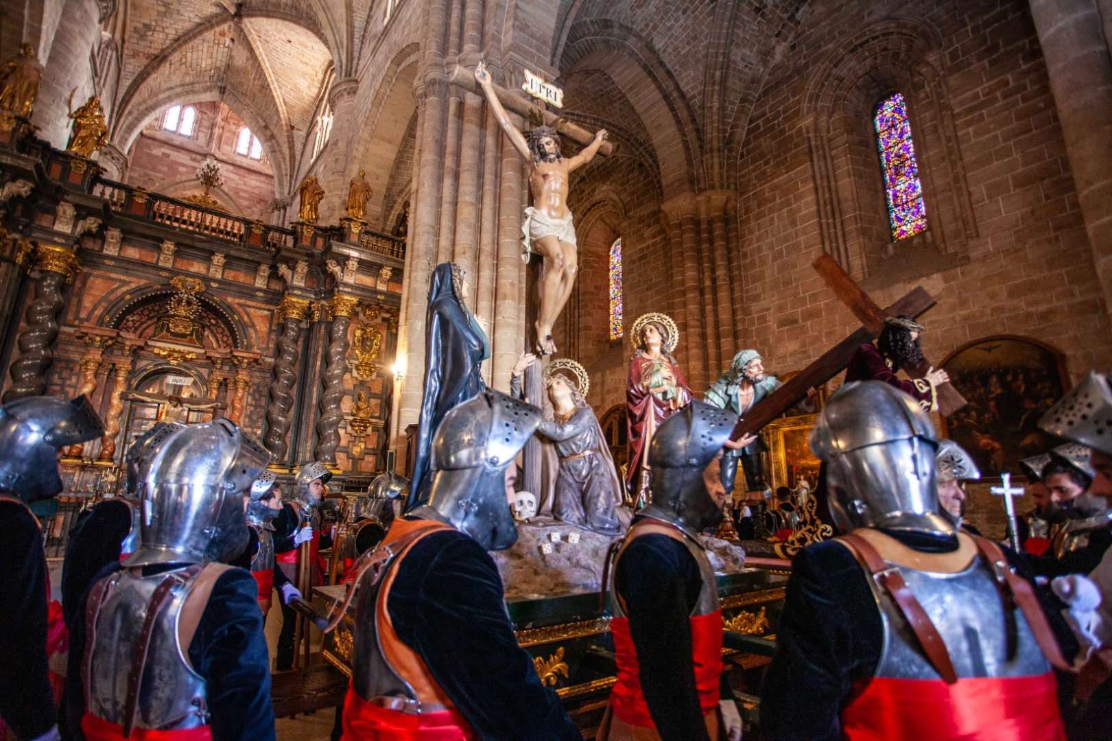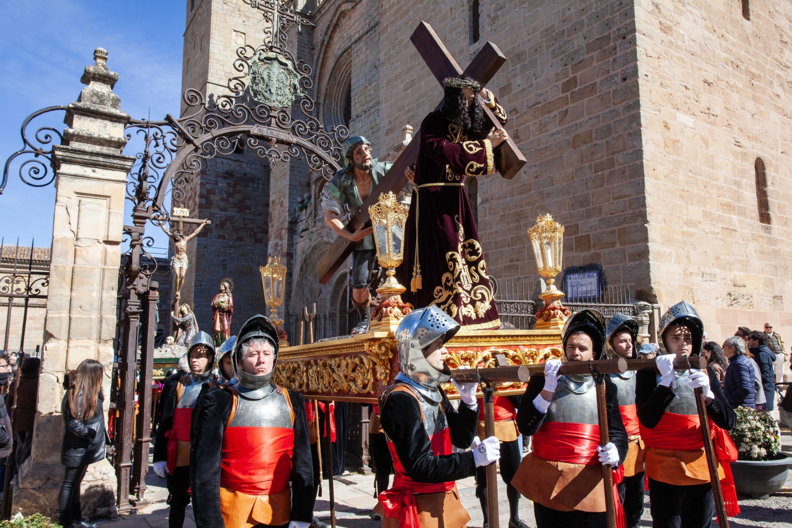 La jornada ha comenzado con el Sermón de Pasión en la Catedral, seguido del solemne Vía Crucis por el Paseo de las Cruces. El momento culminante de la mañana se ha producido a mediodía, cuando las imágenes procedentes de las tres parroquias históricas —San Pedro, Santa María y San Vicente— han confluido en la Plaza de Hilario Yaben. Este encuentro ha dado paso a un gran desfile procesional que ha recorrido las zonas del Humilladero y la Alameda hasta alcanzar la Ermita de la Vera Cruz.