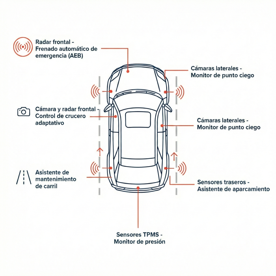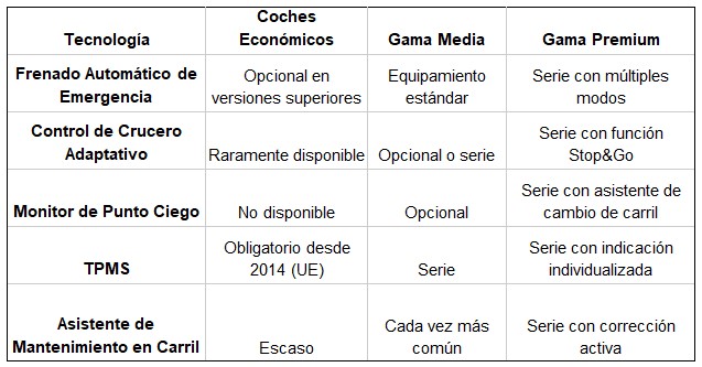 La distribución de tecnologías varía significativamente según la gama del vehículo. El frenado automático de emergencia, antes exclusivo de marcas premium, ahora aparece como opcional en coches económicos y estándar en gama media. El TPMS es obligatorio desde 2014 en la Unión Europea para todos los vehículos nuevos, independientemente del precio.