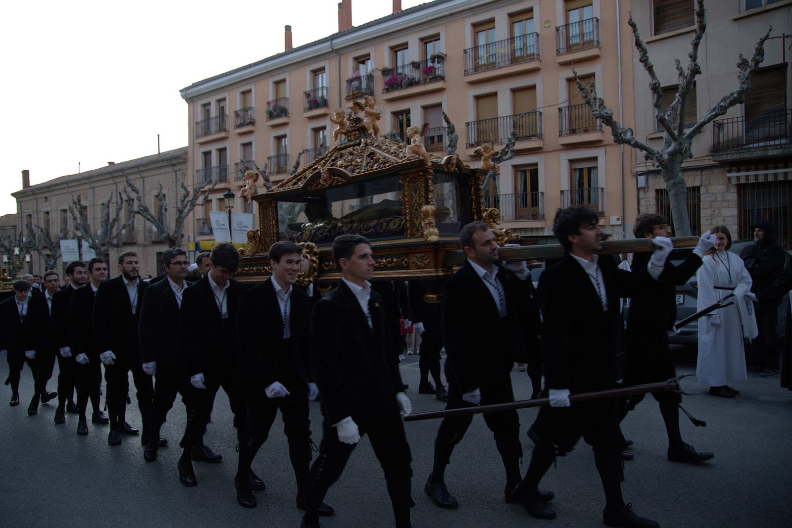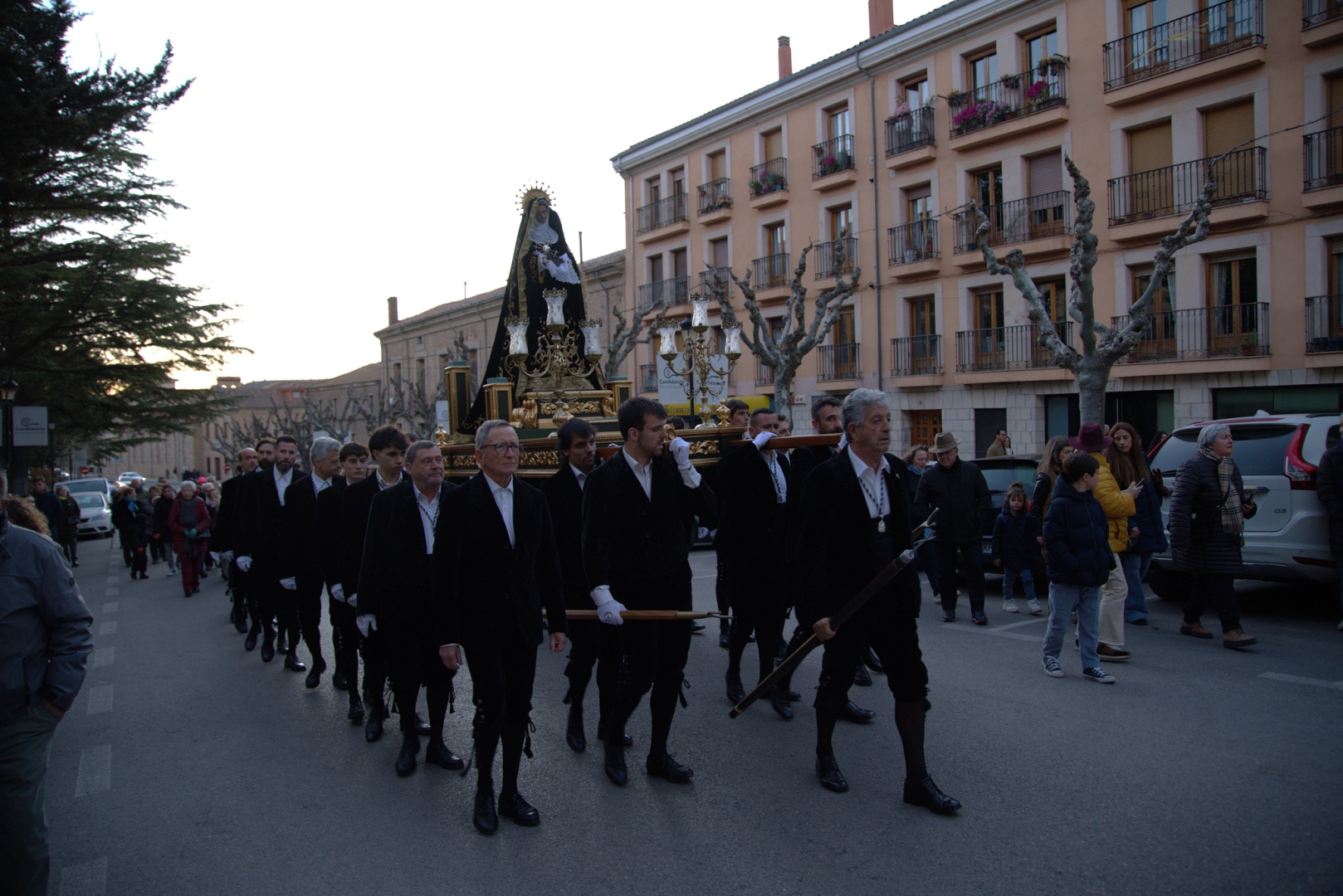 Las calles antiguas parecieron inclinarse ante el misterio de la Pasión, mientras la luz tenue de la tarde-noche envolvía la comitiva en un ambiente de piedad y contemplación.