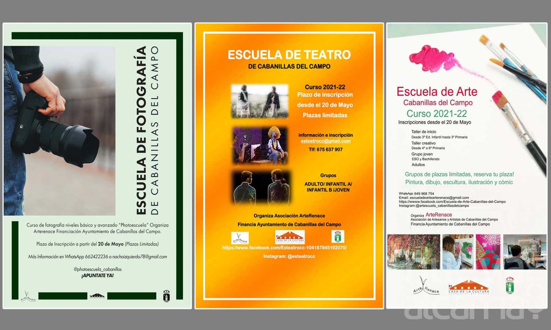 Al igual que en los colegios, el próximo jueves 9 de septiembre arrancará el curso 2021-2022 en las Escuelas de Teatro, Arte y Fotografía que gestiona en Cabanillas del Campo la Asociación ArteRenace. El Ayuntamiento y la citada asociación firmaron hace pocos días un nuevo convenio anual para el desarrollo de estas actividades en instalaciones municipales (Casa de la Cultura y edificio del viejo Ayuntamiento). Hay que señalar que este será el séptimo curso desde que se creó la Escuela de Arte y la Escuela de Teatro; y el sexto de la Escuela de Fotografía; unas escuelas que desarrolla ArteRenace con la cofinanciación del consistorio cabanillero.