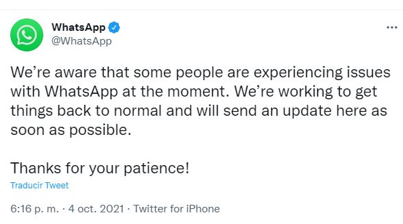 "Somos conscientes de que algunas personas están experimentando problemas con WhatsApp en este momento. Estamos trabajando en ello para regresar a la normalidad. Enviaremos una actualización tan pronto como sea posible".