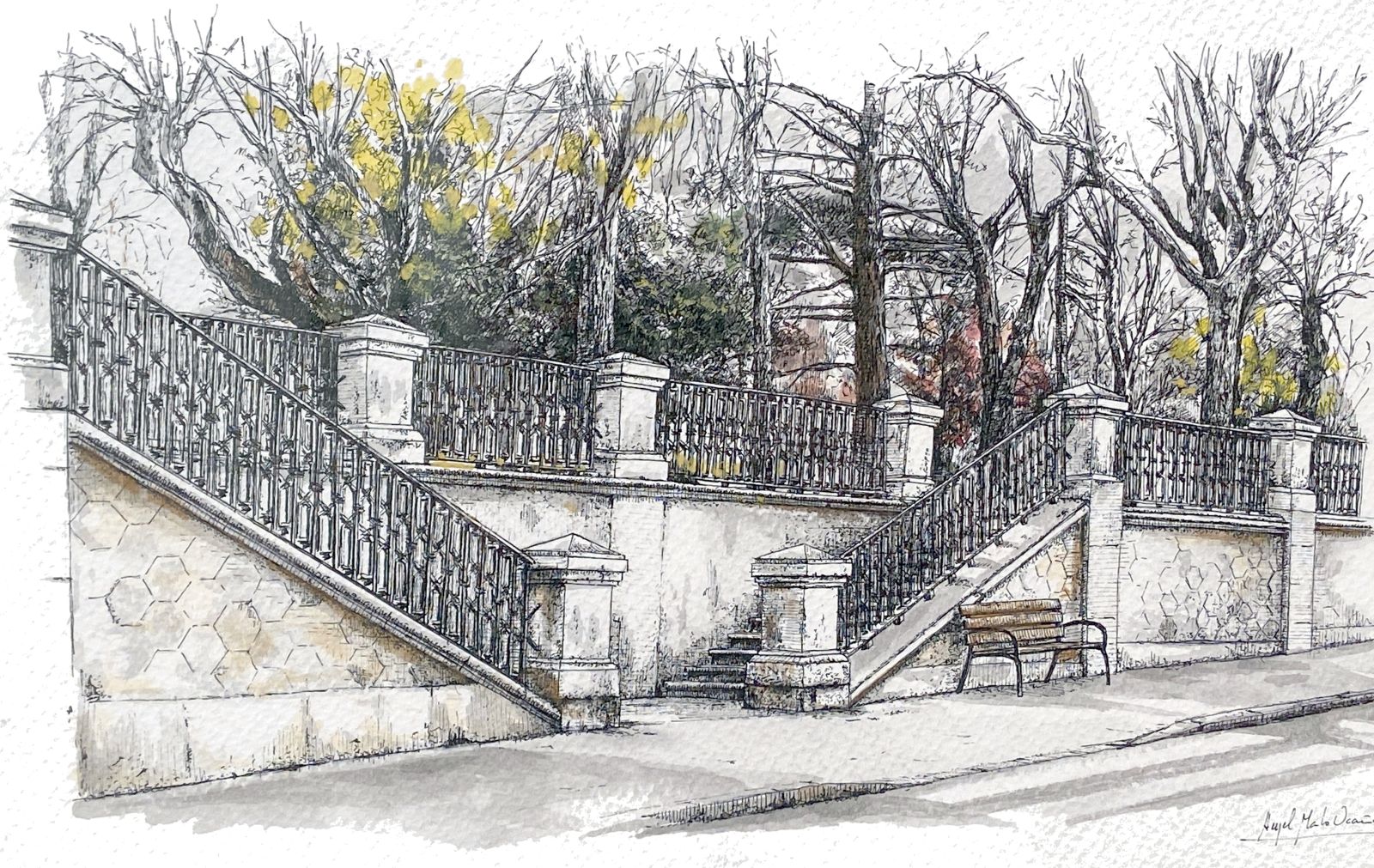 Todos los días pasamos por la Carrera, que es ahora de San Francisco, como siempre lo fue, y nos fijamos en el muro de contención del Paseo de la Concordia sobre ella, al que en los comienzos del siglo XX el Ayuntamiento decidió hacerle una gran escalera de doble tiro para comunicar a los peatones de la cuesta con el parque. A ese detalle urbano, –intrascendente, sí, pero elegante, el artista molinés Ángel Malo Ocaña le ha querido dedicar uno de los dibujos que él sabe hacer, con minuciosidad y empaque, a plumilla y con leve coloración de acuarela, dándole categoría de obra de arte.