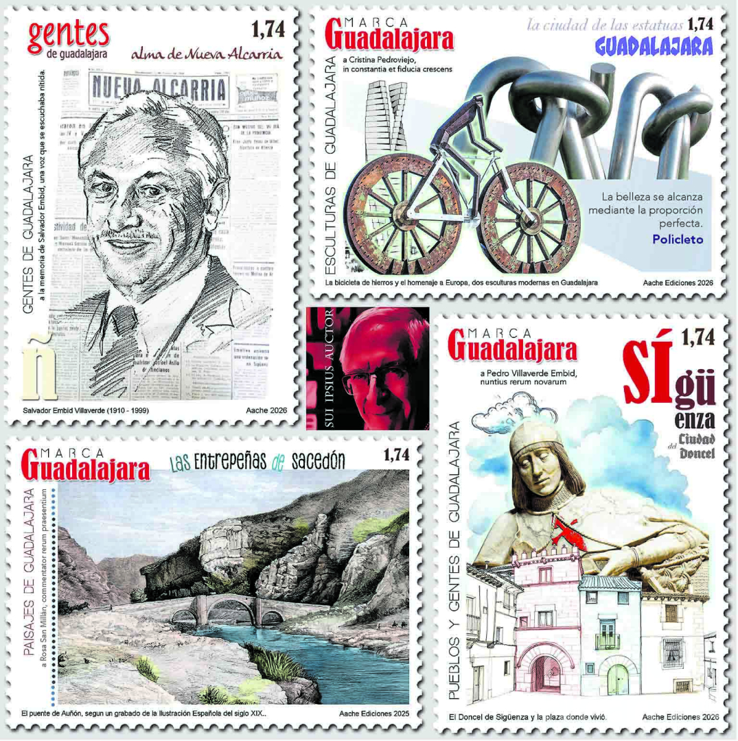 El autor proyectó, como si fueran las páginas de un álbum de sellos, una selección de lugares, paisajes, edificios, fiestas, personajes, historias y sucedidos de la provincia de Guadalajara, sintetizándolos en imágenes dentro de espacios que recuerdan los sellos de correos, conjugando en formas y colores las esencias de una tierra, y dedicando todas y cada una de esas imágenes a personas con quien el autor traba amistad o a quien profesa admiración.