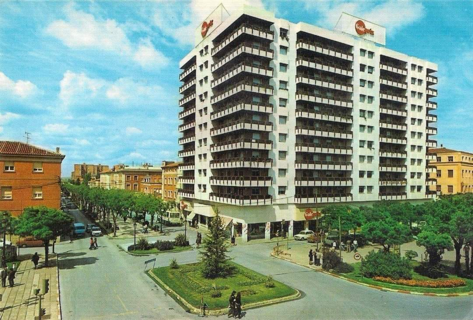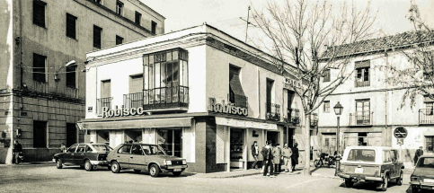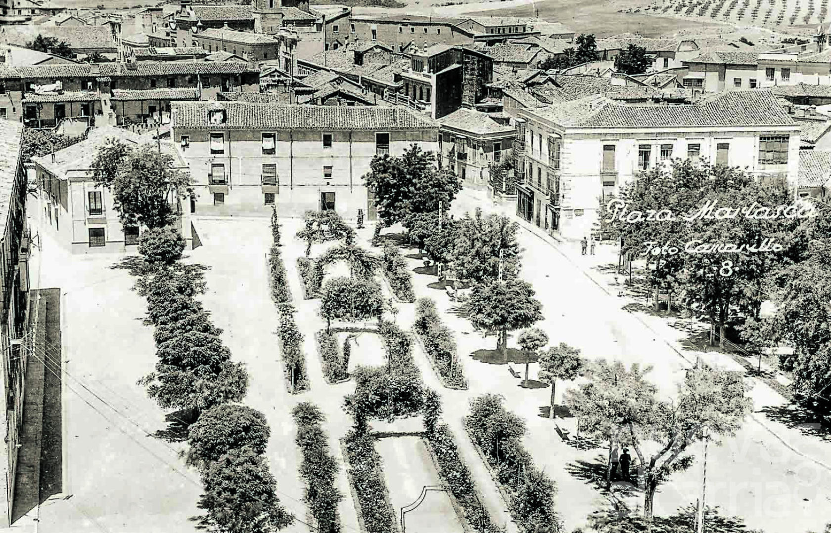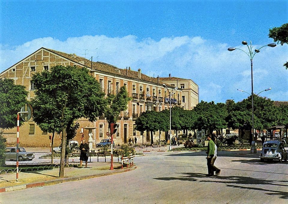 Cruzando la plaza por donde circulan los vehículos con dirección a la calle del Carmen, se encontraba un antiguo edificio que acogía en sus bajos la zapatería de la familia Robisco; tras el derribo integral del edificio se construyó uno más moderno y en sus bajos se encuentran las oficinas de la entidad bancaria del Banco de Santander. Adosado a este edificio se unía uno muy emblemático de la ciudad. En la parte inferior se instalaban la tienda de tejidos El Barato y el inolvidable comercio de ultramarinos: “El Buen Gusto”. El propietario de este establecimiento de alimentación era Fermín Sáenz, cuya especialidad eran los tostados diarios que hacía con cacahuetes y que en la ciudad eran conocidos como los cacahuetes del señor Fermín. Una vez demolido el antiguo edificio se construyó uno más moderno y en sus bajos se instaló la oficina de venta de pisos de la empresa Hercesa Inmobiliaria. Al otro lado de la plaza se hallaba el amplio bloque de viviendas de la familia Solano, allí en la planta baja se encontraba la farmacia de Arsenio García Pizarro y la mercería de Elvira, cuya propietaria era Crisanta Fresno. Hace varios años el edificio se derribó y se ha construido otro más moderno respetando el diseño del antiguo edificio, construido por el empresario local Julián Utrilla.