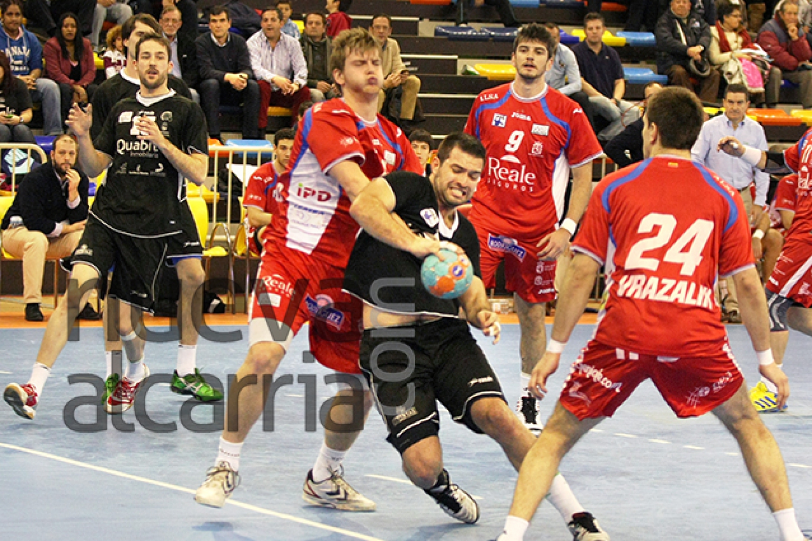 Ruesga, de fuerte disparo, lograba la máxima ventaja hasta el momento (9-13) y Goñi hacía su tercer tanto en el partido para subir el 9-14 al electrónico del Multiusos. Pero Nenadic, desde la izquierda hacía el 10-14. Raúl Nantes, a menos de cinco para el final de la primera mitad, lograba el 10-15. Nuevamente Nenadic, replicaba con el 11-15. Parra, en una buena contra muy bien llevada por los chicos de Garralda, volvía a poner al Quabit BM a tres (12-15). Vrazalic, tras zafarse de su marcaje, hacía el 12-16 con el que se llegó al término de los primeros 30 minutos.
