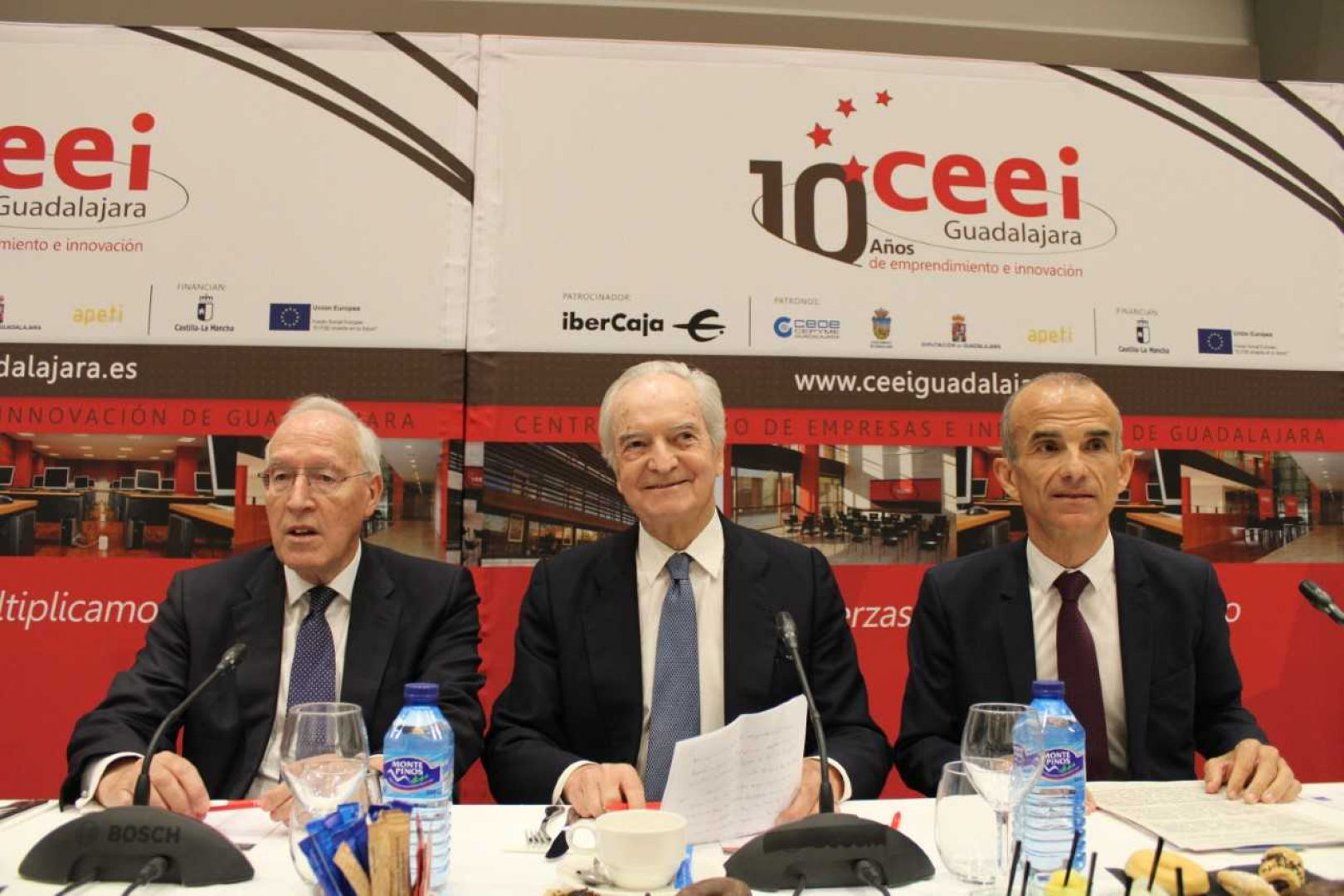 Dentro de los actos programados con motivo del X aniversario de la Fundación CEEI Guadalajara, patrocinados por Ibercaja Banco, se ha desarrollado un desayuno de trabajo, en el Hotel Tryp de la capital, en el que se han reunido cerca de 200 empresarios, autónomos y representantes de la vida política y social de la provincia. Se ha contado con la presencia del presidente de Ibercaja Banco, Manuel Pizarro, presidente de la Real Academia de Jurisprudencia y Legislación de España, junto con Jesús Les Mancho, director territorial de Ibercaja Banco. Agustín de Grandes, presidente de CEOE-CEPYME Guadalajara, durante su intervención, ha agradecido a Ibercaja Banco su compromiso con las empresas de la provincia de Guadalajara, al mismo tiempo que hacía referencia a la valentía de estas mismas empresas para seguir adelante, pese a las incertidumbres de los últimos años.