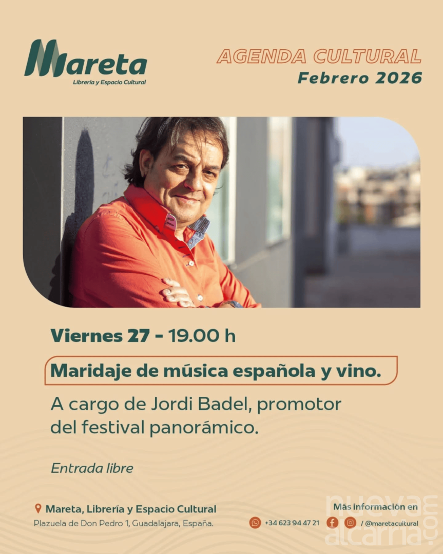 El espacio cultural Mareta, en el centro de Guadalajara, ha programado para el viernes 27 de febrero una actividad que combinará música y vino, dirigida a mayores de edad. La propuesta se celebrará de 19.00 a 21.00 horas en la sede de Mareta, en la plazuela de Don Pedro, 1C, junto al mercado de abastos.