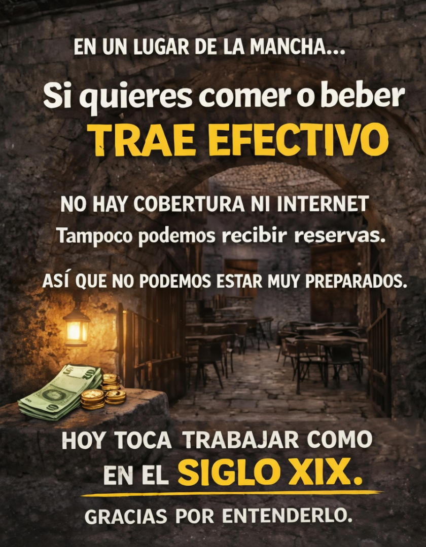 El cartel que han colgado en redes y en la puerta del bar ya es viral: “En un lugar de La Mancha… Si quieres comer o beber, trae efectivo. No hay cobertura ni internet. Tampoco podemos recibir reservas. Así que no podemos estar muy preparados. Hoy toca trabajar como en el siglo XIX. Gracias por entenderlo.”