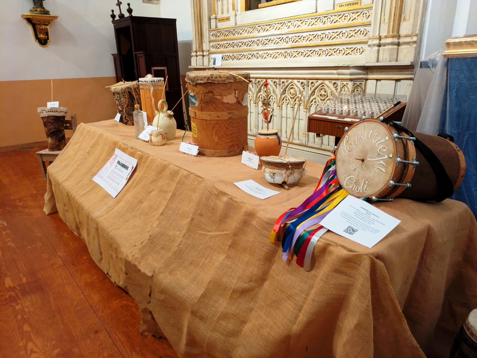 Los asistentes al acto pudieron contemplar, además, una EXPOSICIÓN DE ZAMBOMBAS de la colección de FÉLIX NOLASCO, instalada en una de las capillas laterales de la Iglesia. Félix posee una de las colecciones más extensas y curiosas de este instrumento de todo el país, aunque, en este caso, sólo se ofrecía una pequeña muestra, debido al espacio reducido de la capilla. Hace años que la colección viene recorriendo nuestra geografía provincial –Certamen de Rondas de Torija, Posada del Cordón de Atienza, Centro San José en Guadalajara-, y otros lugares de la península como el Centro Etnográfico “El Caserón” de San Sebastián de los Reyes (Madrid) o el festival Folk Segovia.