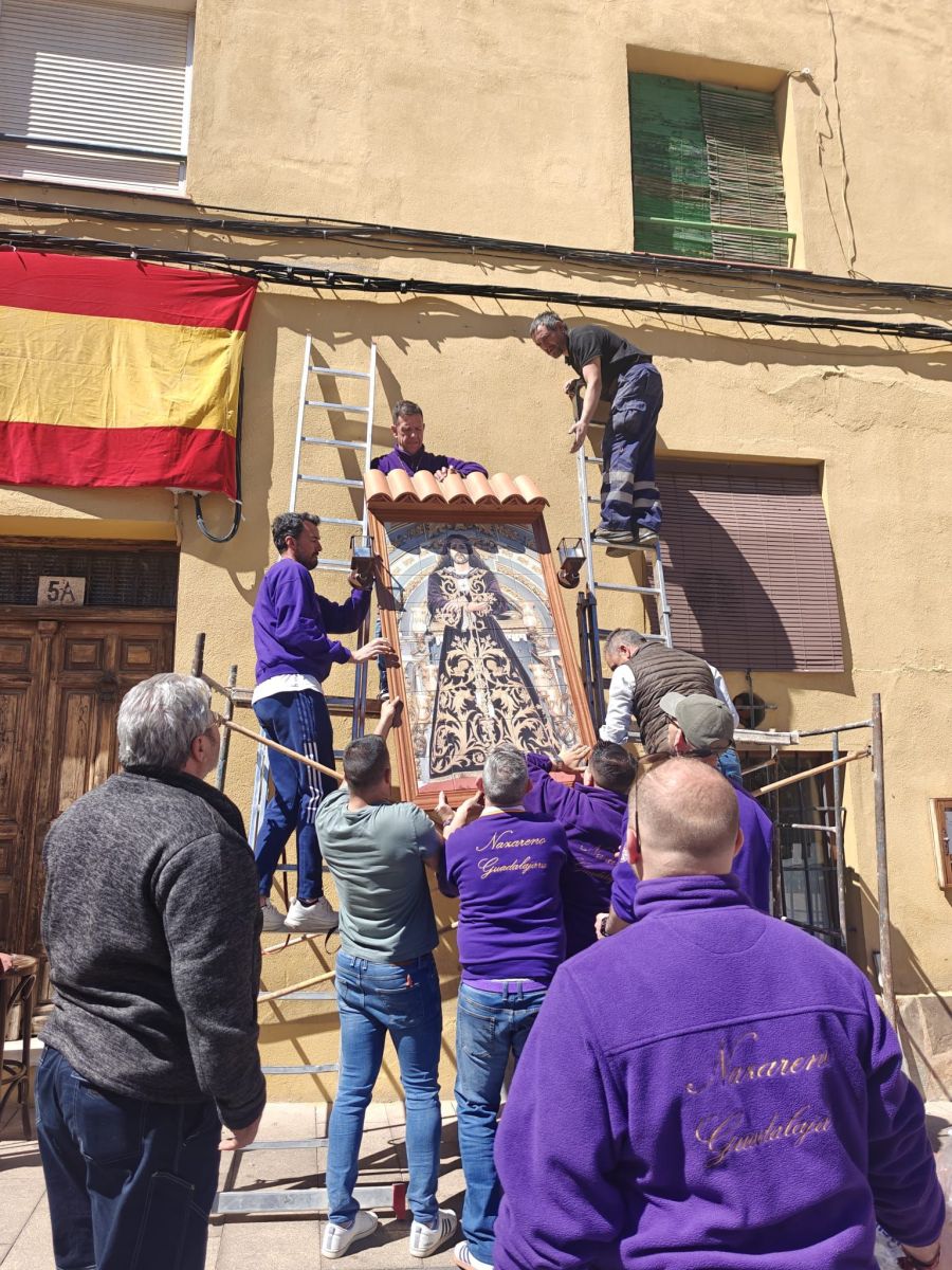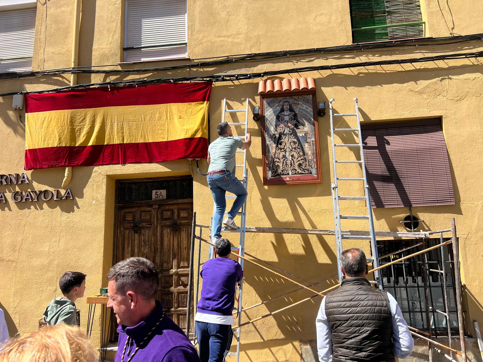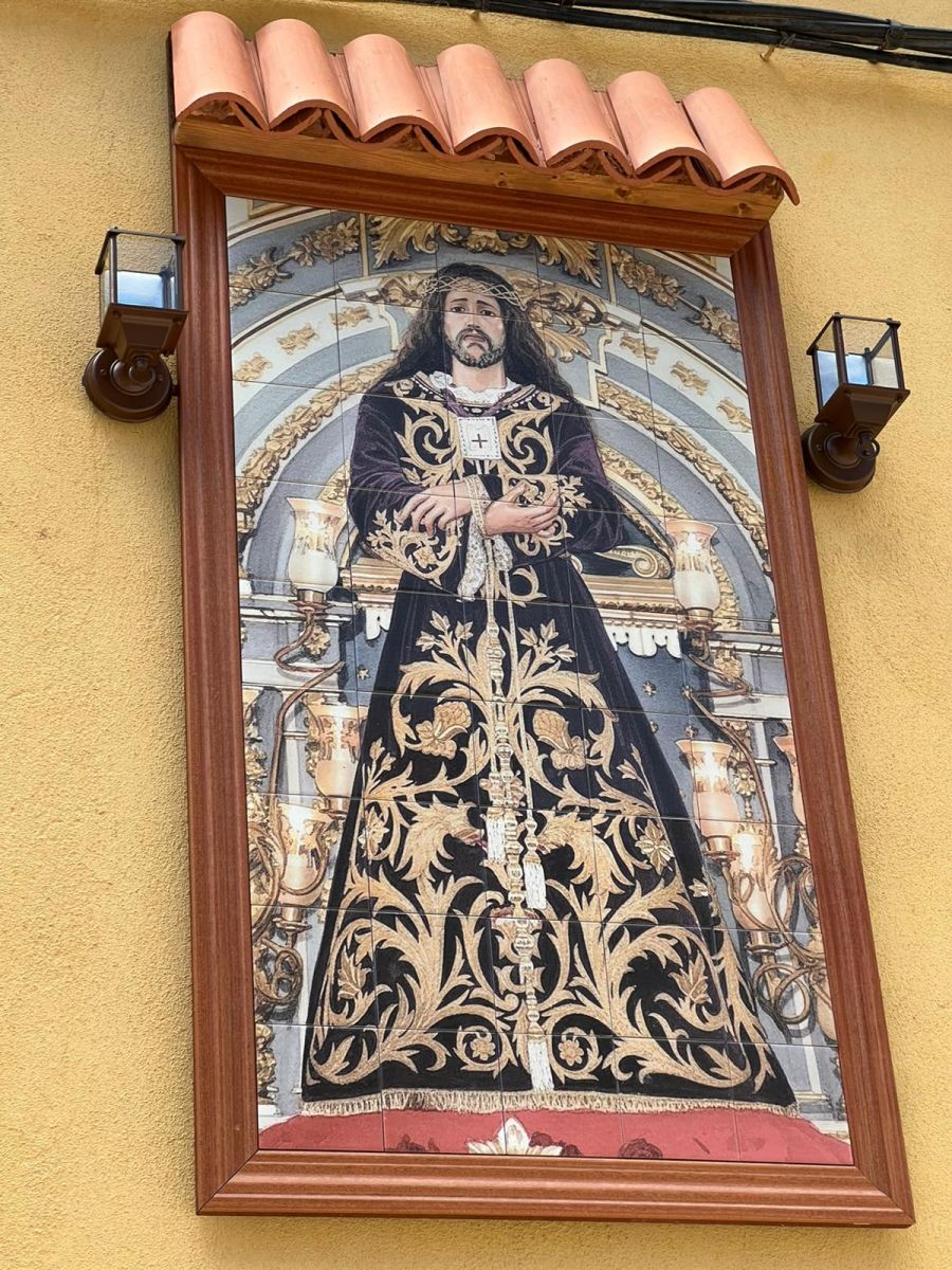 Entre risas, algún “¡un poquito más a la izquierda!” y la mirada curiosa y atenta, con gestos de admiración, de los vecinos que se paraban a observar, el Nazareno ya luce en Plaza de San Esteban: un espectacular panel de cerámica tradicional, enmarcado en madera con tejadillo de teja y dos faroles a los lados. La imagen del Señor, con túnica morada bordada en oro, corona de espinas y esa mirada que llega al alma, brilla como un paso en miniatura. Al lado ondea la bandera de España, como si el propio Cristo bendijera el barrio.