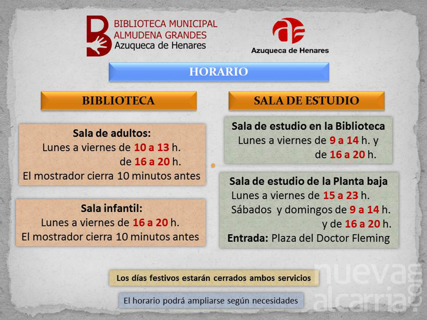 La edil azudense recuerda el horario de atención de la Biblioteca Municipal. “La sala de adultos presta servicio de 10 a 13 y de 16 a 20, mientras que el acceso a la sala infantil solo se puede realizar por las tardes, de 16 a 20 horas”, detalla. La atención en el mostrador finaliza diez minutos antes.