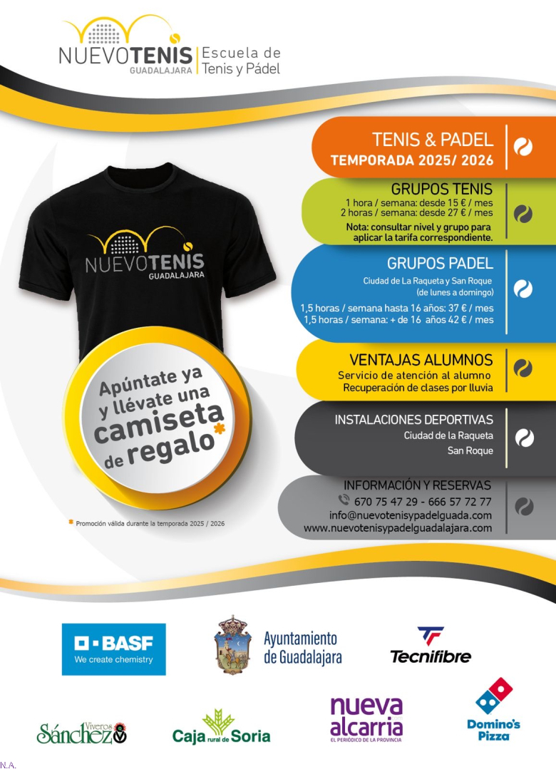 Nuevo Tenis - Escuela de Tenis y Pádel Guadalajara ya ha abierto las incripciones para temporada 2025/206. La escuela, con la colaboración del Ayuntamiento de Guadalajara y el respaldo de importantes patrocinadores como BASF y Tecnifibre, busca fomentar la práctica de estos deportes de raqueta en la ciudad.