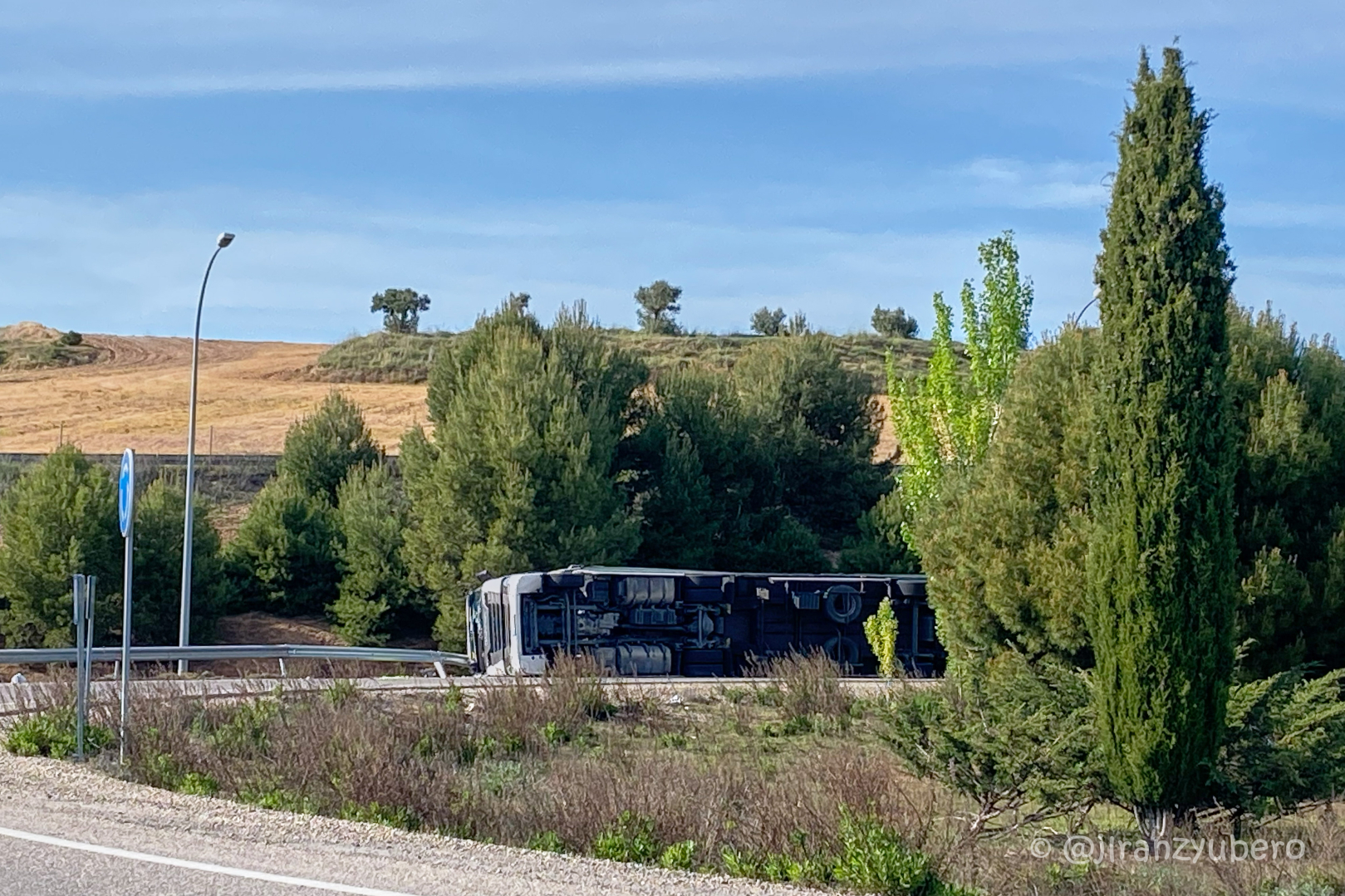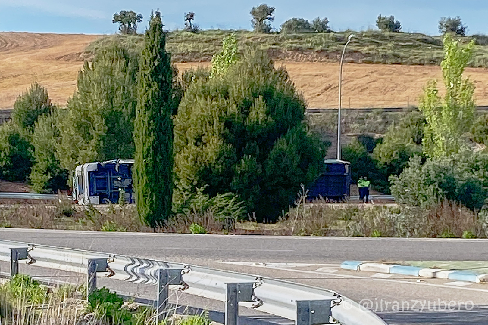 Las fotografías, tomadas entre las 18.20 y las 18.30 horas por José Luis Ranz Yubero, muestran al vehículo pesado volcado sobre uno de sus laterales en el interior de la glorieta. Hasta el lugar se desplazaron agentes de la Policía Local en la zona para regular el tráfico y señalizar la incidencia.