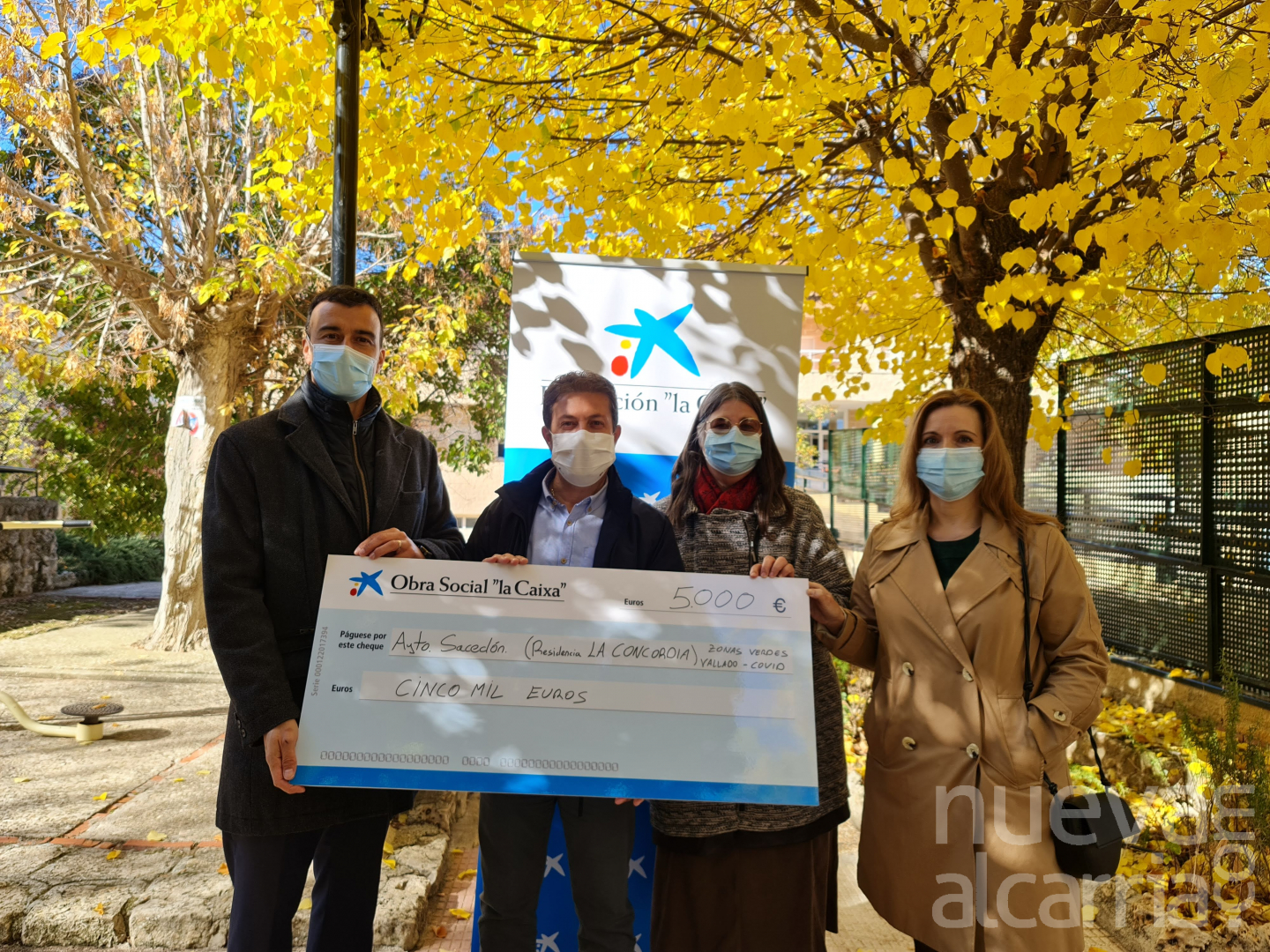 Ricardo Medina, director de la oficina de La Caixa en Sacedón, hizo entrega del simbólico cheque de cinco mil euros al alcalde de la localidad, Francisco Pérez Torrecilla, que acudió acompañado de las concejales Catherine García y Alicia Guitart. El pequeño acto se llevó a cabo in situ, a las puertas de la residencia, dónde se colocará el vallado. No pudieron acudir los responsables del centro, por precaución, debido a la situación de alerta sanitaria en la que nos encontramos.