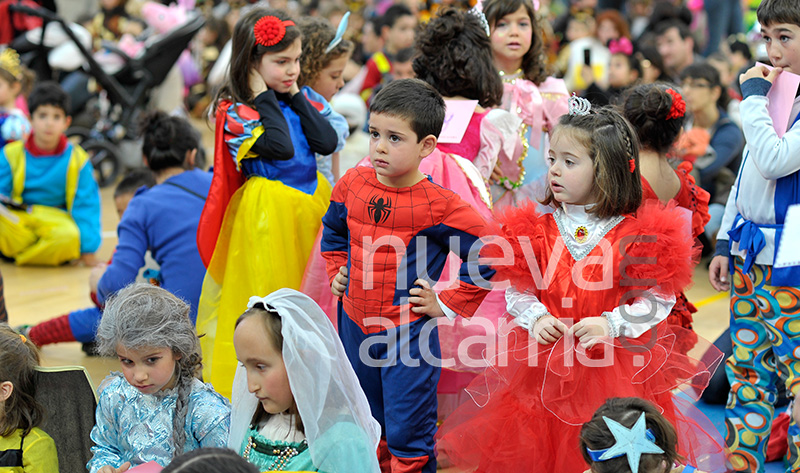 El esta ocasión, el certamen de disfraces infantil se simultaneó con el de adultos porque este último, programado para el día de ayer, tuvo que ser pospuesto a causa de la lluvia. Pequeños y mayores llenaron de colorido la pista del polideportivo, amenizada por música durante el tiempo de espera de la deliberación del jurado. Uno a uno fueron desfilando por la pasarela del escenario. Algunos lo hacían bailando, otros de manera tímida, algunos con coreografía preparada, como las Botargas, los tres jóvenes disfrazados del tradicional trofeo de oro, plata y bronce que se entrega en este certamen. Los tres posaron como si de verdad se trataran de las estatuillas, sacando la sonrisa de los espectadores (y resultando segundos en la categoría de Parejas o Tríos, con premios de las peñas El Buey y Choítos). Tras ellos, y como un guiño al cuento de Hansel y Gretel, los dos hermanos, con casita de chocolate y bruja malvada incluida, obtuvieron el tercer premio en esta misma categoría infantil, con trofeo y regalos cortesía de las peñas El Tarro y Bizcocho Borracho.