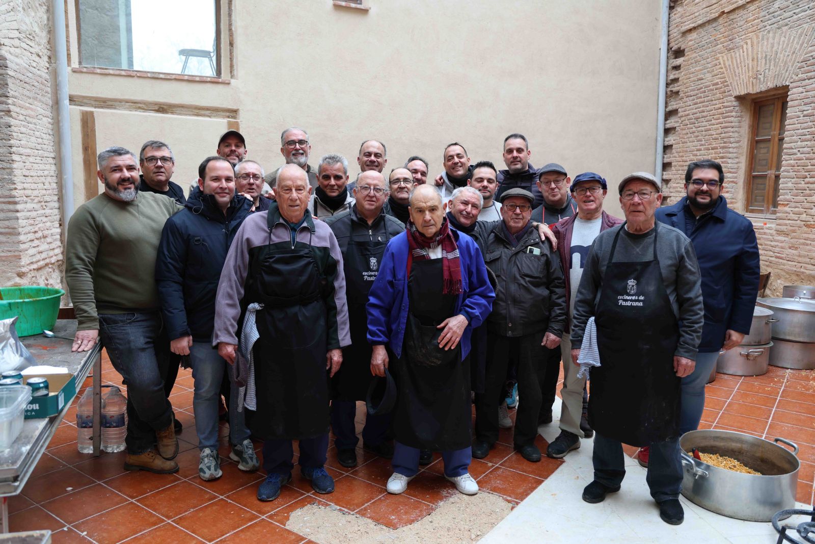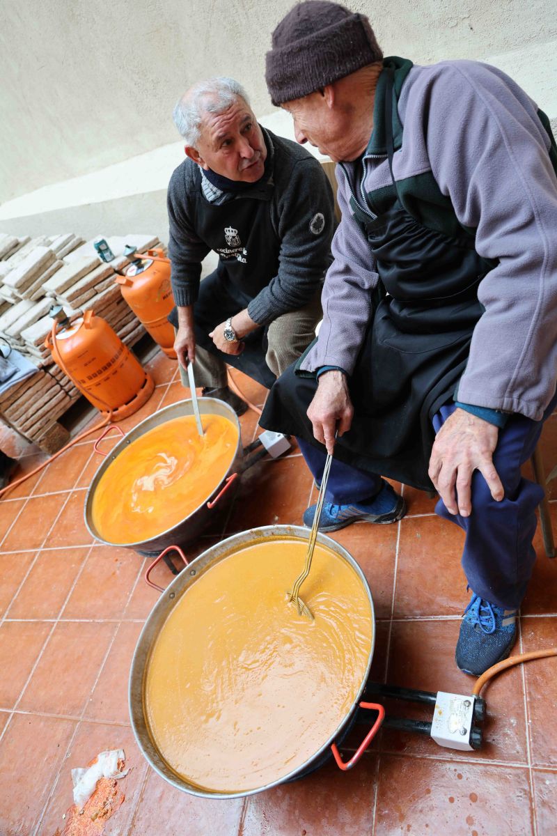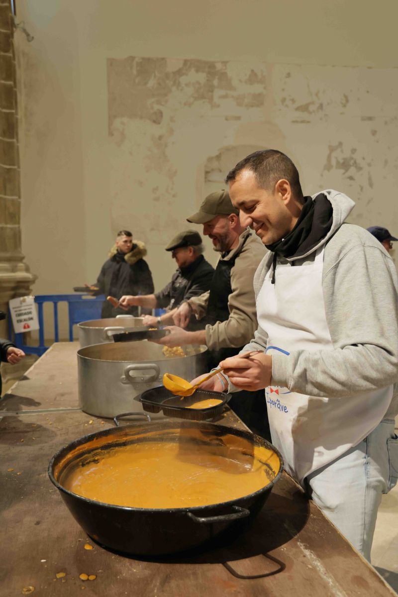 Detrás de los calderos y las sartenes se mezclaron la experiencia y el relevo generacional. La Asociación de Jubilados volvió a ser el fuego y la sabiduría de la cocina, acompañada por un grupo creciente de jóvenes que aprenden observando y ayudando. Entre los primeros estaba Román Vereda, pastranero de 85 años, o de 21, según se mire, puesto que cumple años cada 29 de febrero. Román ha dedicado su vida profesional a la alta cocina, sin perder nunca el vínculo con su pueblo. Él mismo resumía el sentido de la jornada cuando explicaba que “esto si se deja se pierde” y que, por eso, “estamos aquí colaborando unos con otros para que esto siga funcionando”. Un año más, este pastranero, que cocinó en su día para la reina Fabiola y el rey Balduino, de Bélgica, siguió haciéndolo, junto a sus compañeros y amigos de toda la vida, para los vecinos y visitantes de Pastrana. A su lado, Samuel García Ranera representaba ese aprendizaje silencioso que asegura continuidad, pinche hoy para poder enseñar mañana lo que otros enseñaron antes.