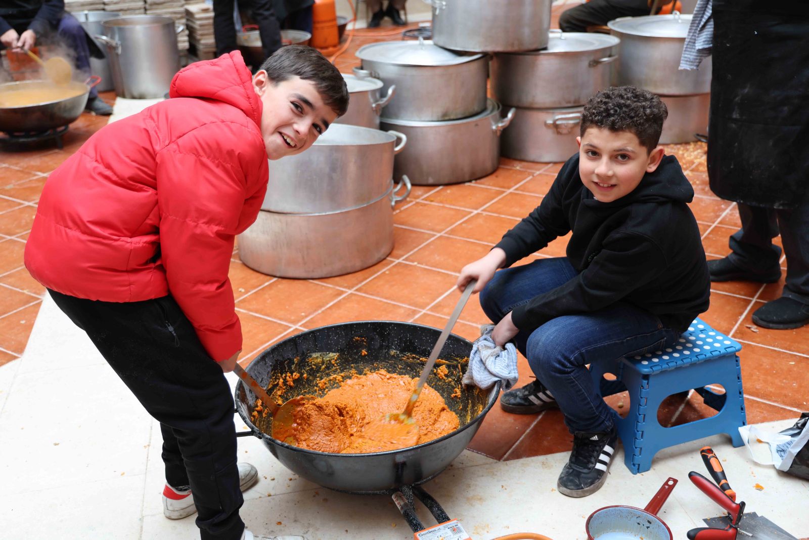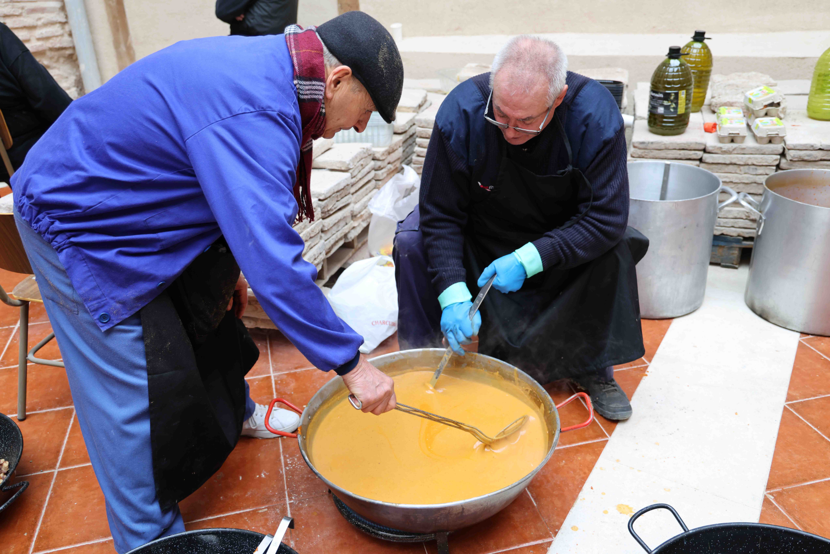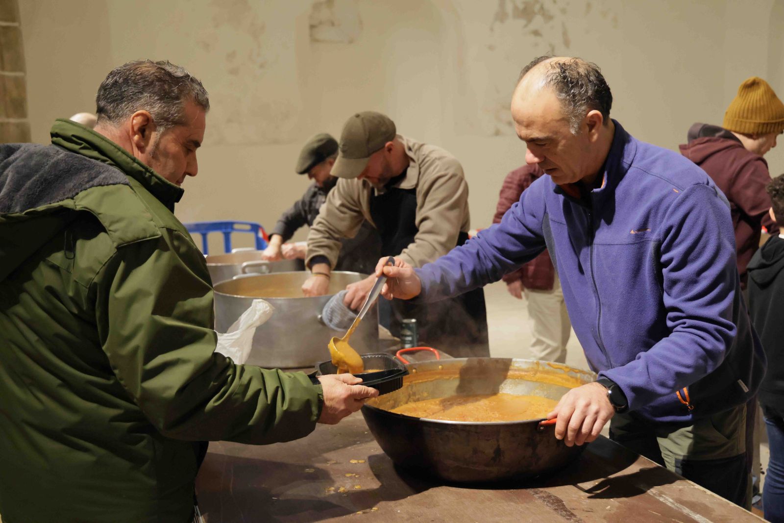 Detrás de los calderos y las sartenes se mezclaron la experiencia y el relevo generacional. La Asociación de Jubilados volvió a ser el fuego y la sabiduría de la cocina, acompañada por un grupo creciente de jóvenes que aprenden observando y ayudando. Entre los primeros estaba Román Vereda, pastranero de 85 años, o de 21, según se mire, puesto que cumple años cada 29 de febrero. Román ha dedicado su vida profesional a la alta cocina, sin perder nunca el vínculo con su pueblo. Él mismo resumía el sentido de la jornada cuando explicaba que “esto si se deja se pierde” y que, por eso, “estamos aquí colaborando unos con otros para que esto siga funcionando”. Un año más, este pastranero, que cocinó en su día para la reina Fabiola y el rey Balduino, de Bélgica, siguió haciéndolo, junto a sus compañeros y amigos de toda la vida, para los vecinos y visitantes de Pastrana. A su lado, Samuel García Ranera representaba ese aprendizaje silencioso que asegura continuidad, pinche hoy para poder enseñar mañana lo que otros enseñaron antes.