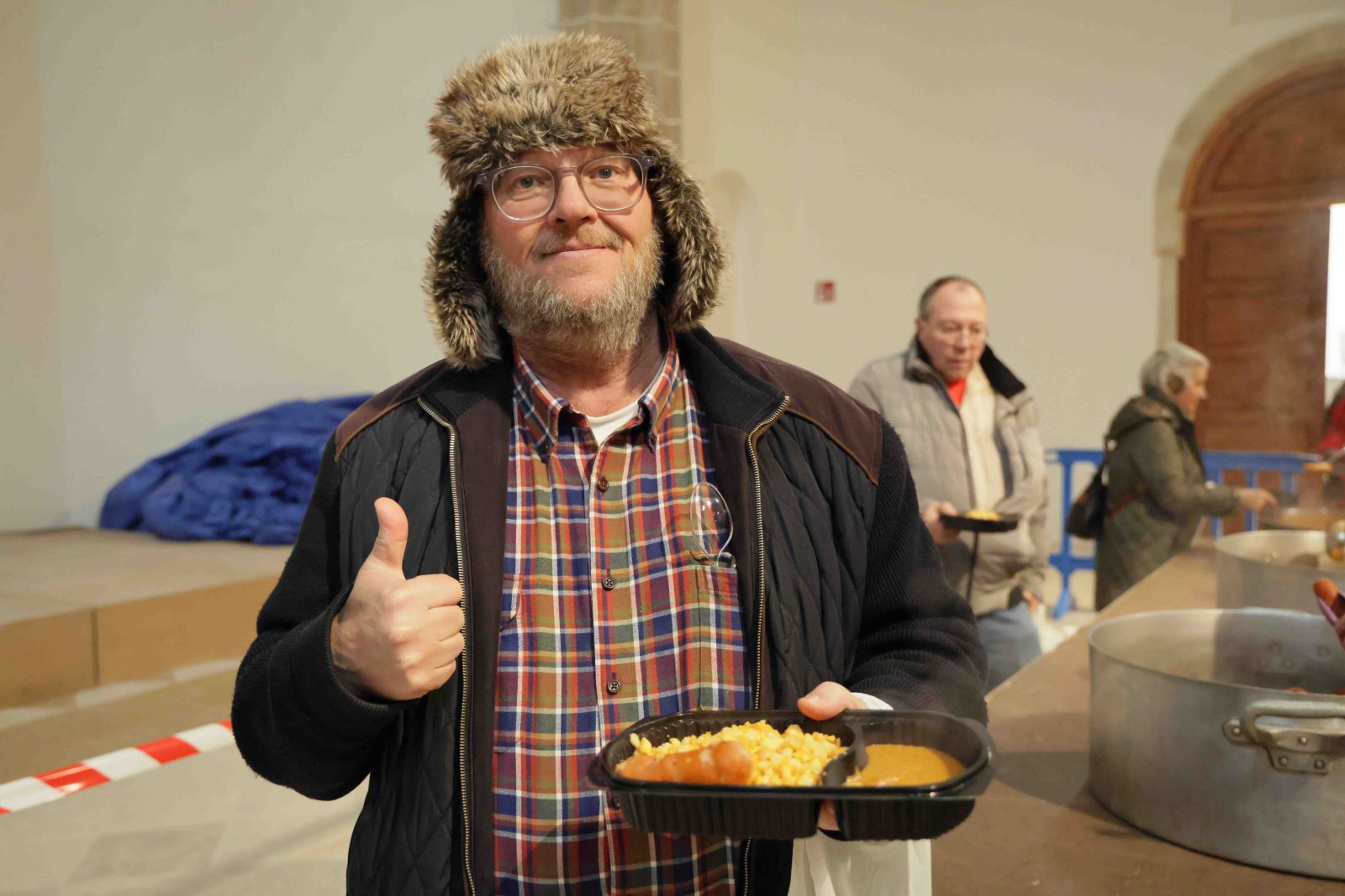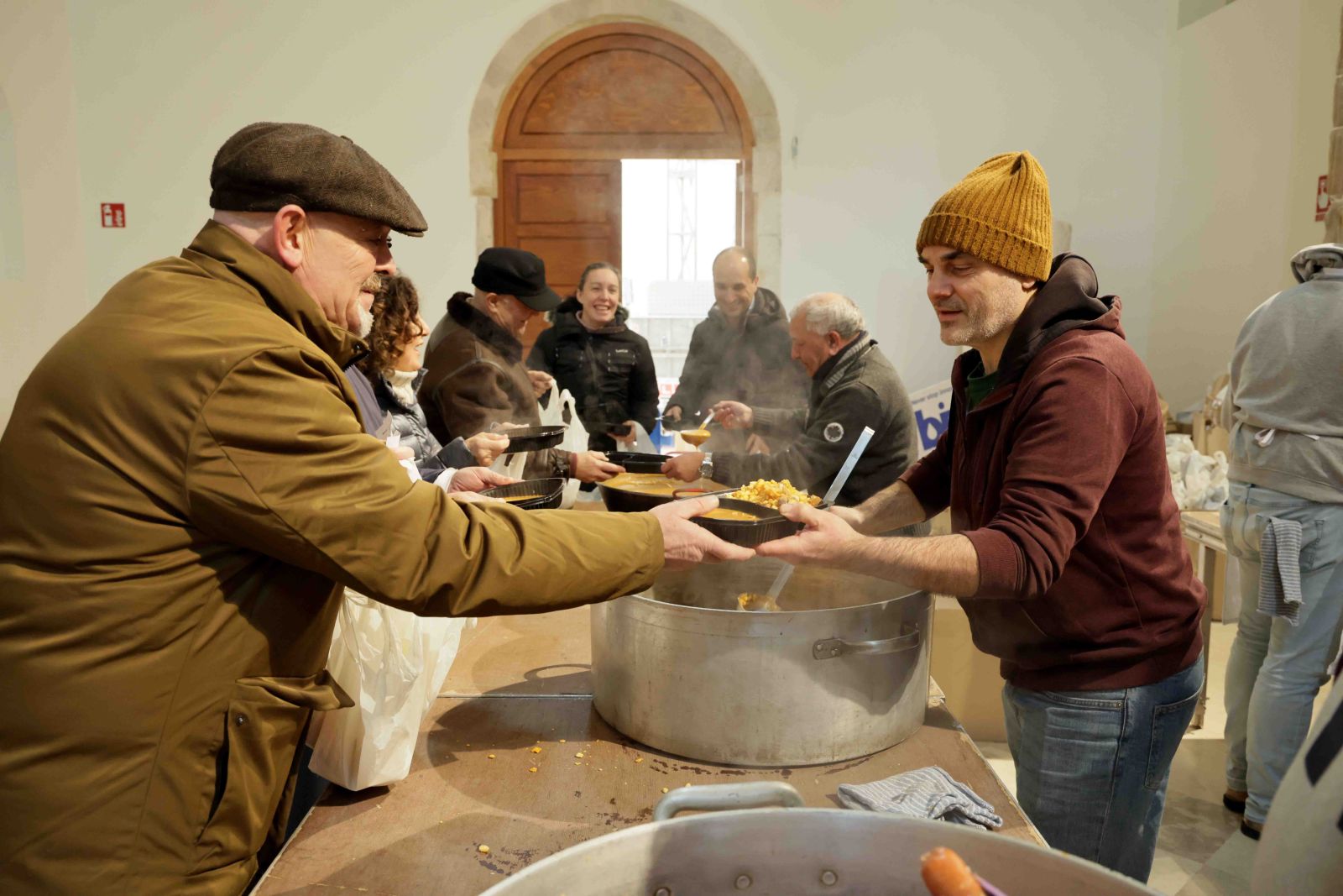 Quienes se sentaron a la mesa en la gran nave del convento, que había sido dispuesta para que los pastraneros se agruparan por familias y amistades, confirmaron el valor cotidiano de estos platos. Las gachas y las migas, que forman parte del menú pastranero durante todo el invierno, se compartieron como se hace siempre, sin solemnidades añadidas. Salceda León, vecina y buena conocedora de la receta, resumía la opinión general cuando afirmaba que estaban “ricas, ricas, ricas” y que “cuanto más frío hace, mejor vienen las gachas”. Andrés García, su marido y otro de los comensales, añadía que “los cocineros son todos del pueblo y lo hacen muy bien”. De fondo, mientras lo contaban, se escuchaban las coplas de los Dulzaineros de Guadalajara, asiduos a la fiesta.