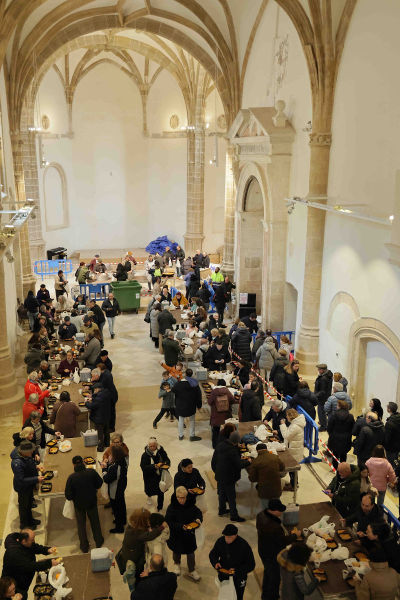 El sábado al mediodía, la gastronomía ocupó el centro de la celebración. La comida popular de migas y gachas, elaboradas al estilo pastranero, reunió a un millar de personas. La previsión de bajas temperaturas y posibles nevadas -que luego se cumplía- obligó a trasladar la cita al interior del convento de San Francisco, donde se habilitó la nave principal para mantener el ritual de cada año. Allí se sirvieron más de mil raciones de un menú que incluyó gachas, migas, chorizo, pan, naranja y vino, preparados con 120 kilos de miga seca, 65 kilos de harina de almortas, 1.200 chorizos y decenas de kilos de panceta, en un esfuerzo logístico que comenzó desde primera hora de la mañana.