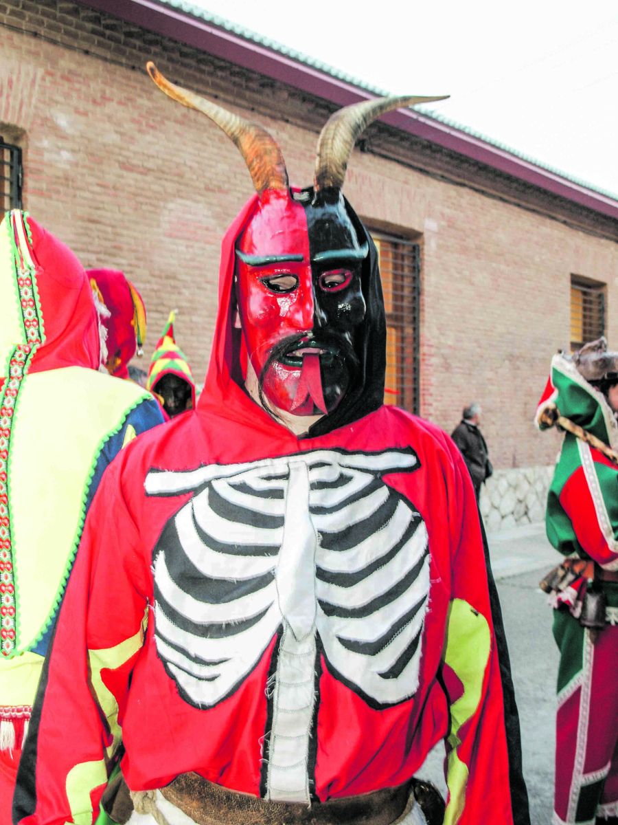 CORNÚPETAS DE CARNAVAL, TOROS DE FUEGO Y DIABLOS.- Pero hay otros personajes de nuestro folklore que llevan lo animalesco hasta en el nombre. Se trata de las “vaquillas” de carnaval, que, según vamos conociendo, estuvieron extendidas por gran parte de nuestra geografía y que, poco a poco, van siendo “recuperadas”. En este caso, se trata de seres diferenciados de las botargas, aunque últimamente comparten espacios y ritos urbanos; son personajes claramente carnavalescos que salen para asustar y perseguir a los transeúntes. El disfraz más generalizado es el de individuos con la cara tapada, que portan sobre los hombros unas amugas o “jamugas”, apero agrario éste que, atado sobre las costillas del ganado mular, servía para cargar sobre él los haces de los cereales y otros productos. En la parte delantera llevan colocados dos cuernos y en la parte trasera, o en la cintura, se cuelgan cencerros de variado tamaño, que hacen sonar al moverse. En este caso su comportamiento es claramente animal, pues intentan “topar” con sus cuernos a los transeúntes, imitando a los auténticos cornúpetas. Su disfraz se suele completar con una tela negra o paño rojo, en el caso de los “vaquillones” de Villares de Jadraque; en esta localidad, al disfraz se le añade una especie de chiflo con membrana que los serranos se colocan en la boca para disimular su voz y que no se les reconozca.