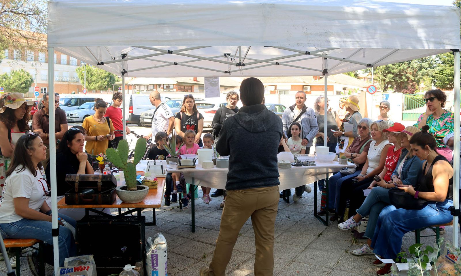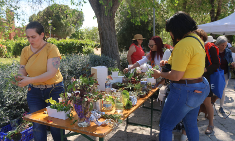 Ubicado a la entrada del parque por la calle Cuzco, frente a la Biblioteca, el Encuentro fue un constante ir y venir de aficionados a las plantas y de curiosos, que se interesaban por la iniciativa, intercambiaban plantas, o pagaban un euro por ellas, en una iniciativa solidaria en favor de la Asociación Caminando. Se colocaron casi una decena de puestos de intercambio de material, algunos de asociaciones como la citada Caminando o El Rincón Lento; y otros de particulares. Incluso hubo presencia de un grupo de aficionadas al intercambio de plantas llegadas desde la vecina Chiloeches.