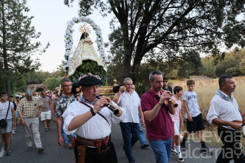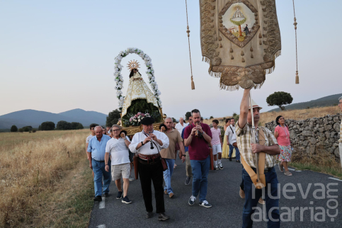 Pasadas las 20:30 horas, la Virgen salió de la ermita portada a hombros por los agalloneros, en el arranque de una procesión que discurrió entre sabinas centenarias, enebros y formaciones rocosas de gran belleza natural. Durante todo el trayecto, las dulzainas y tamboriles de los Gaiteros Mirasierra —fieles a la cita desde hace más de dos décadas— acompañaron la comitiva con música tradicional que llenaban de autenticidad el ambiente. Faltó, muy a su pesar, el gran Valentín Pérez, gaitero de Atanzón, y hermano de honor de la hermandad de la Virgen de los Enebrales, a quien todo el pueblo de Tamajón desea una pronta recuperación para verlo pronto tocando de nuevo, y dándole alegría a las celebraciones agalloneras.