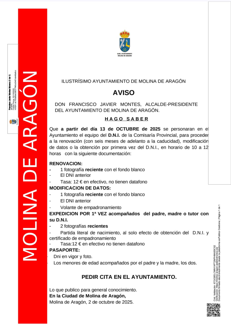 El Ayuntamiento de Molina de Aragón, dirigido por el Alcalde-Presidente Francisco J. Montes, ha trasladado un anuncio para los ciudadanos de la localidad. A partir del próximo 13 de octubre de 2025, un equipo del D.N.I. de la Comisaría Provincial de Guadalajara, se trasladará al Ayuntamiento para facilitar la renovación, modificación de datos y la obtención del Documento Nacional de Identidad (DNI) por primera vez.