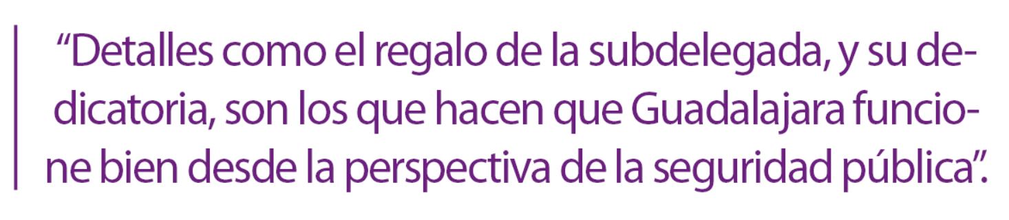 Es un obsequio que me hizo la subdelegada del Gobierno, en representación de toda la Subdelegación. Me ha permitido comprobar cómo me ve la gente. Cuando te apasiona tu trabajo, haces las cosas con ilusión, incluso las más desagradables. La dedicatoria la llevaré en el corazón para siempre: “Para la Teniente Coronel, Cristina Moreno, esperando que el humanismo y la ilusión, como el Quijote, te acompañen siempre. Con todo nuestro cariño, tus compañeros “civiles” de Guadalajara”. Esto es lo que hace que Guadalajara funcione bien desde la perspectiva de la seguridad pública, a todos los niveles.