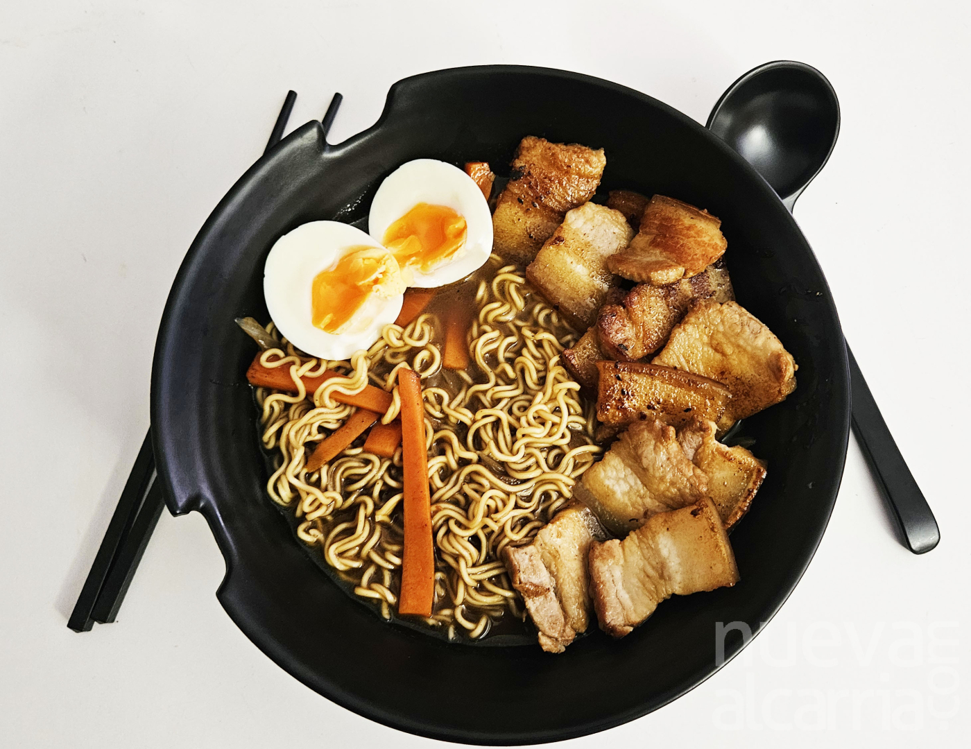 Emplatado: Sirve los noodles con su caldo en un bol. Corona con la panceta dorada, el huevo partido por la mitad y un toque de cebollín fresco.