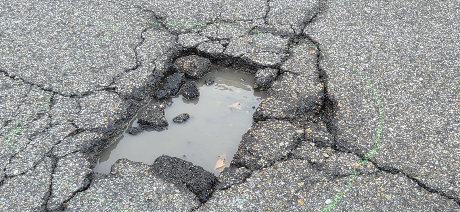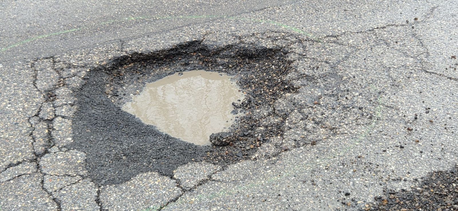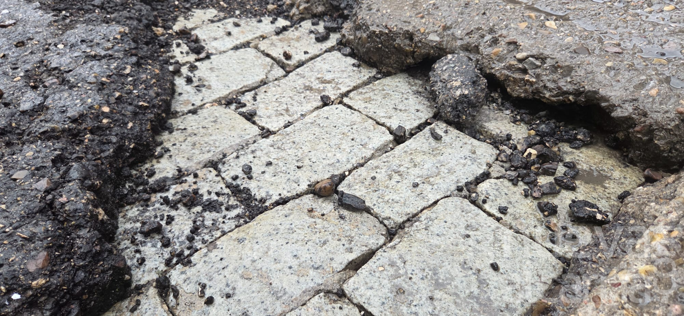 En la calle Ramón y Cajal, el deterioro del firme ha provocado la pérdida de capas de asfalto, lo que permite ver el adoquinado antiguo sobre el que se asienta la vía. En algunos tramos, los adoquines quedan al descubierto entre restos de asfalto levantado y pequeños desprendimientos. Los huecos son más profundos que una tarjeta de crédito, alcanzando entre 8 y 10 cm de profundidad.
