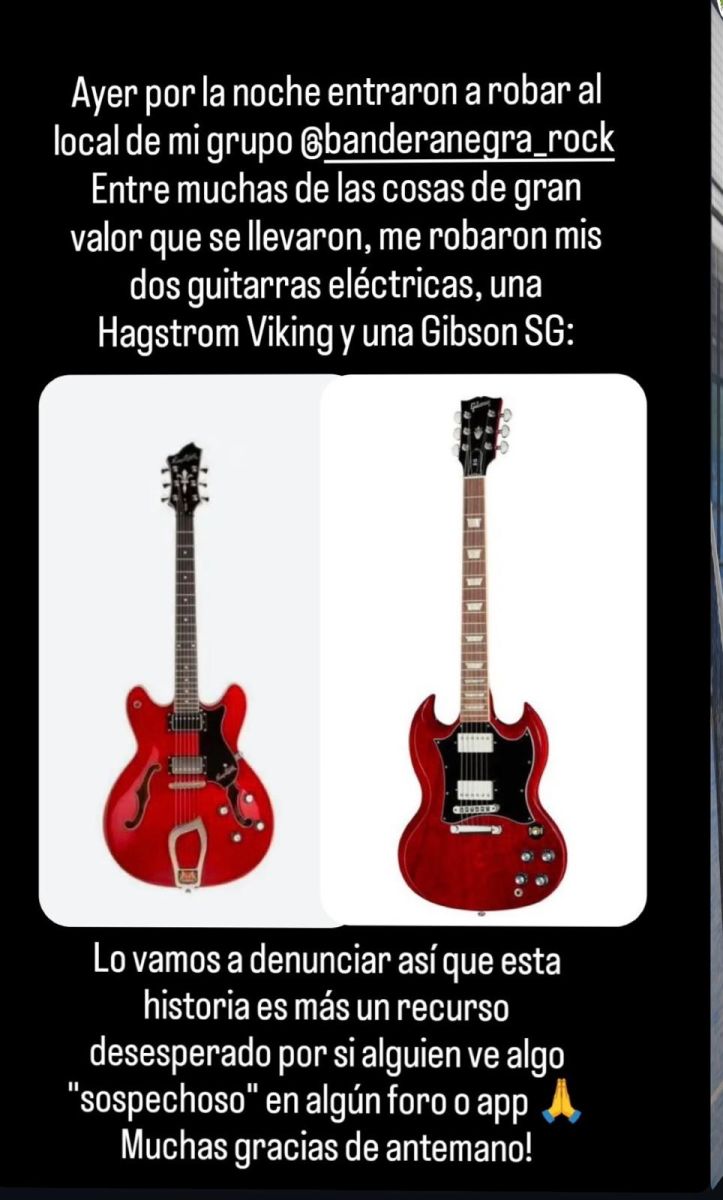 El grupo de música Bandera Negra ha sufrido un robo en el local donde ensayan, situado en Iriepal. Entre los objetos sustraídos se encuentran dos guitarras eléctricas, una Hagstrom Viking y una Gibson SG, así como las luces y todo el equipo de sonido del local.