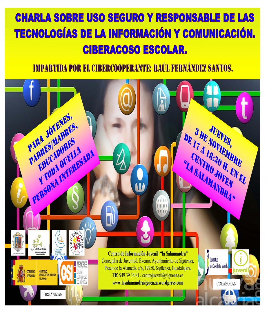 Este próximo jueves, día 3 de noviembre, propiciada por La Salamandra, va a tener lugar una charla sobre el uso seguro y responsable de las tecnologías de la información y comunicación (TIC) y sobre el ciberacoso escolar. La actividad tendrá lugar en la misma sede de La Salamandra, a partir de las 17 horas de la tarde, y hasta las 18:30 y será impartida por Raúl Fernández Santos, del programa Cibercooperantes del Instituto Nacional de Ciberseguridad (INCIBE) y la Oficina de Seguridad del Internatuta (OSI) del Ministerio de Industria, Energía y Turismo del Gobierno de España.