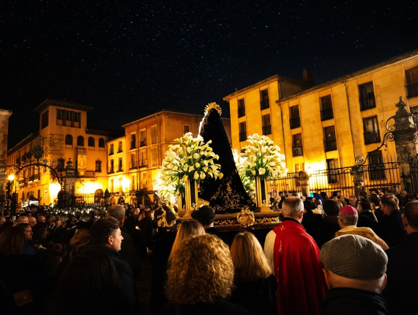 La procesión transcurrió en un silencio casi absoluto, roto únicamente por el sonido de los pasos y el crepitar de las velas. La noche fría y clara de abril envolvió las calles medievales de Sigüenza, creando un ambiente de gran intensidad espiritual. Vecinos, cofrades y visitantes formaron un respetuoso pasillo humano a lo largo del itinerario.