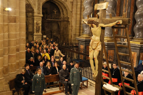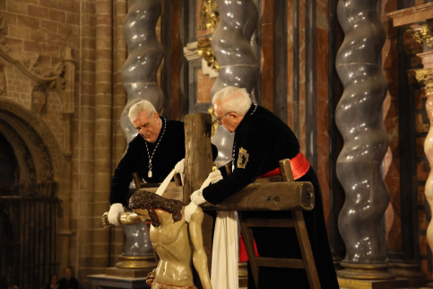 Poco después, en el interior de la majestuosa Catedral, se revivió uno de los ritos más antiguos y conmovedores de la Semana Santa seguntina: la Ceremonia del Descendimiento. En un ambiente de profundo recogimiento y con la belleza barroca de las imágenes como protagonista, los armaos eméritos (hermanos de carga veteranos vestidos con hábito negro y faja roja) procedieron con delicadeza y solemnidad a desclavar la imagen del Cristo crucificado.
