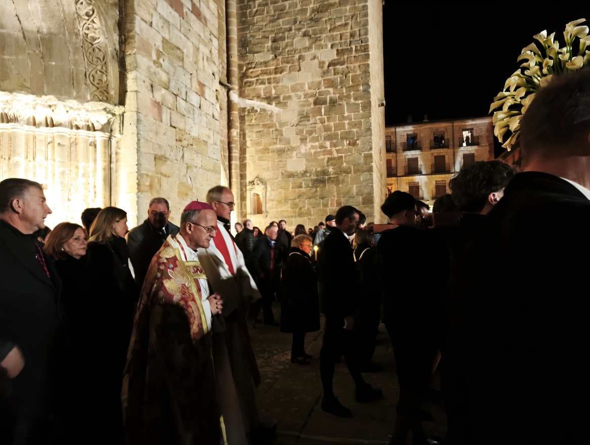 Finalizada la ceremonia, dio comienzo la Procesión del Santo Entierro, también conocida como Procesión del Silencio. El cortejo, presidido por el Santo Sepulcro y acompañado por la Virgen de la Soledad, salió de la Catedral y recorrió las calles Cardenal Mendoza y José de Villaviciosa en dirección a la Ermita de San Lázaro (ubicada en el recinto de la Residencia de Ancianos Padre Saturnino López Novoa).