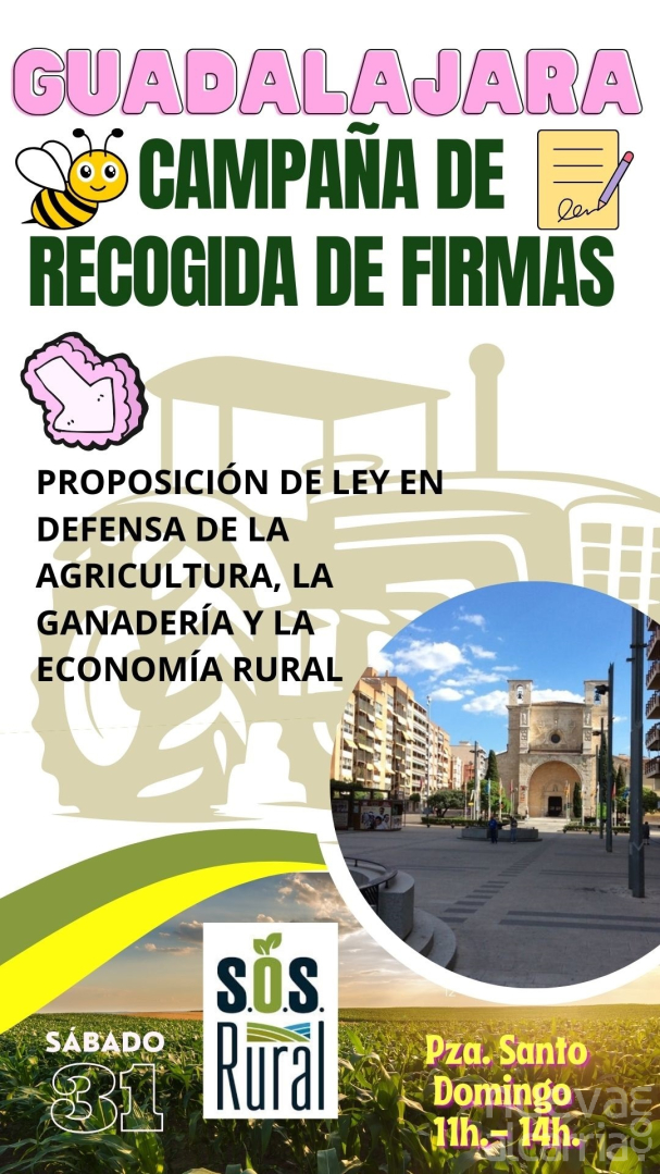 Este sábado 31 de agosto SOS Rural estará en la Plaza de Santo Domingo de Guadalajara recogiendo firmas para solicitar al Congreso de los Diputados la aprobación de una ley que proteja la economía rural en España y de especial manera la agricultura y la ganadería.
