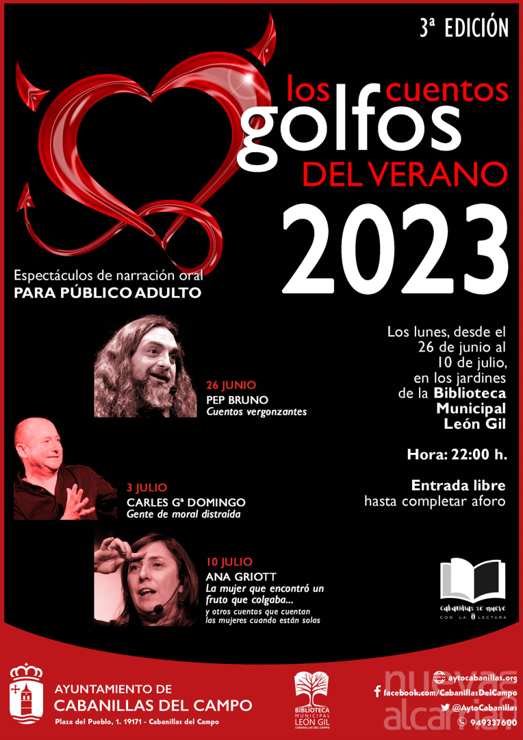 Por tercer verano consecutivo, la Concejalía de Cultura del Ayuntamiento de Cabanillas del Campo organiza «Los cuentos golfos del verano», un ciclo de narración oral para público adulto que se desarrollará durante tres lunes consecutivos de este verano, desde el 29 de junio hasta el 10 de julio. Las sesiones se desarrollarán en los jardines de la Biblioteca Municipal León Gil.