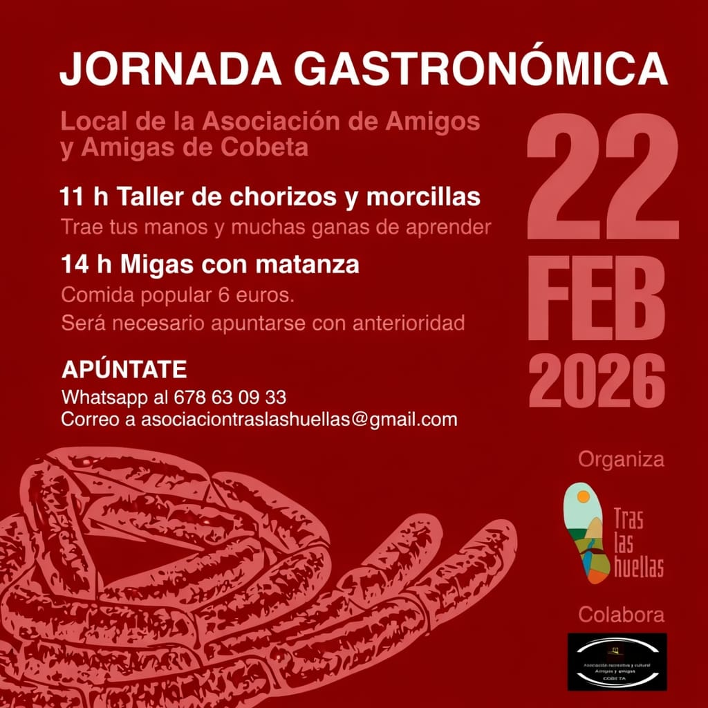 La localidad de Cobeta se prepara para vivir una jornada de exaltación de sus tradiciones culinarias. El próximo 22 de febrero de 2026, el local de la Asociación de Amigos y Amigas de Cobeta será el escenario de una Jornada Gastronómica que rinde homenaje a la cultura de la matanza y la convivencia vecinal.