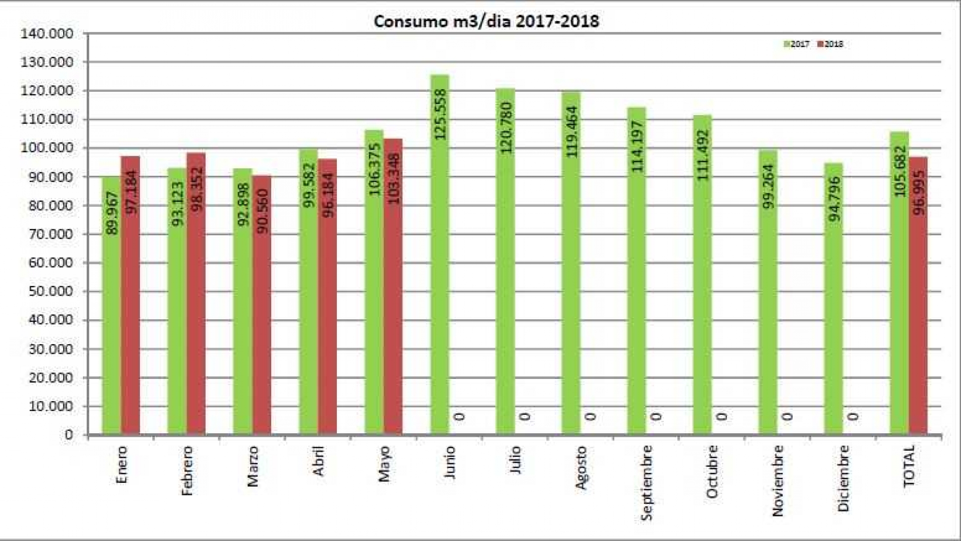 Con respecto al volumen facturado, a todos los municipios suministrados, el presidente informó de que en los cinco primeros meses del año, la cifra es de 14.840.168m3, prácticamente la misma cantidad facturada en el mismo período del año anterior. Si nos centramos en el consumo medio diario del último mes, podemos ver cómo en el mes de mayo de 2017 se facturaron un total 106.375 m3 por día y este año se han facturado 103.348 m3.
