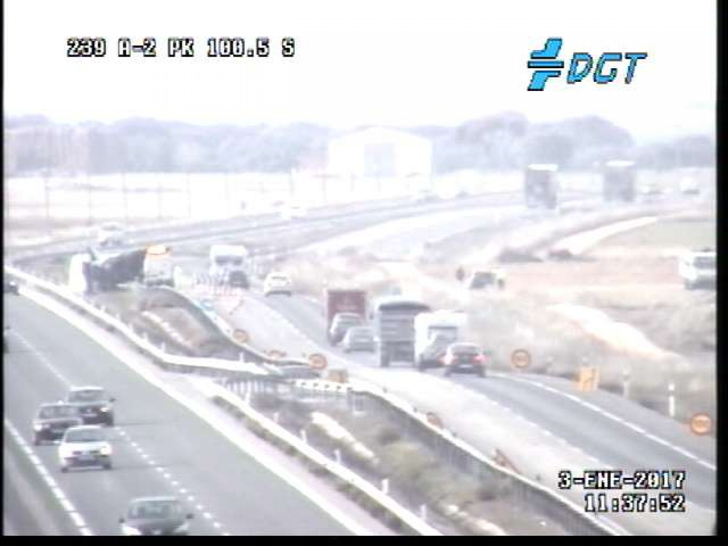 El primer accidente ha tenido lugar en el kilómetro 103 de la A-2 tras salirse de la vía un camión cuyo conductor se ha fracturado la cadera. (En la imagen de la DGT puede verse el camión volcado). Poco después en el kilómetro 99 un trabajador de Obras Públicas ha sido atropellado y trasladado en ambulancia UVI también al Hospital.