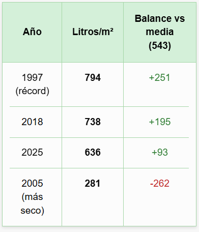 Respecto a los potenciales efectos del calentamiento global sobre las precipitaciones, el ingeniero responde con datos: “Analizando los 30 años completos, es como si desde 1996 cada año lloviera 1,5 litros/m2 menos de media". En cambio -continúa- "si analizamos las cifras desde 2005 -el año más seco, con 281 litros hasta 2025, cada año llueve 6 litros/m2 más".