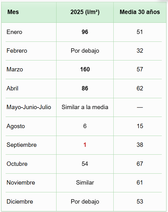 “Este año ha sido bastante húmedo, con un balance hídrico positivo de 93 litros respecto a la media. Comparado con España, donde AEMET registró 696 litros (un 8 % por encima de su media en los últimos 30 años), Tortonda también resultó más húmeda de lo habitual".